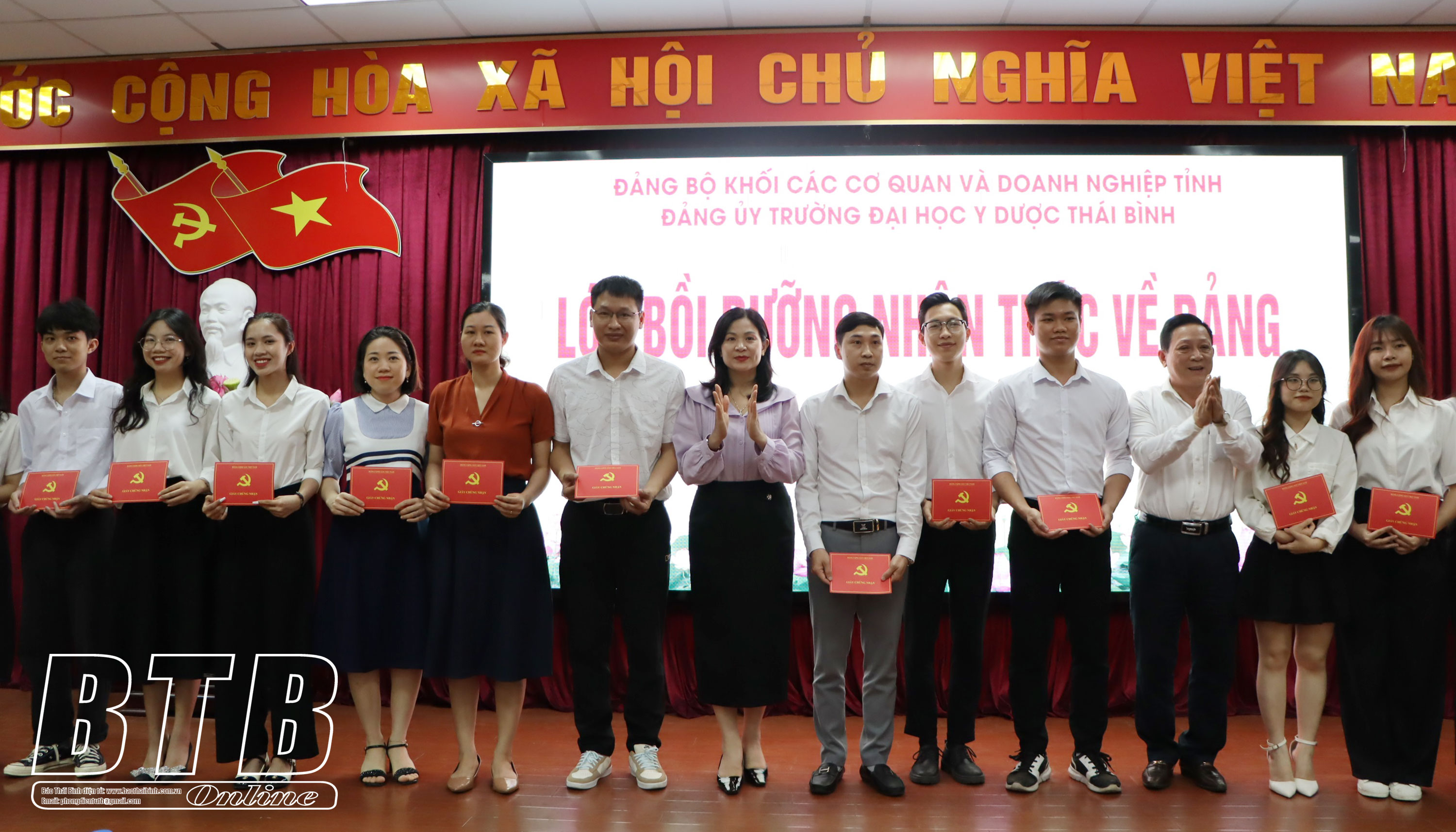 Lãnh đạo Đảng ủy Khối Các cơ quan và Doanh nghiệp tỉnh và Đảng ủy Trường Đại học Y Dược Thái Bình đã trao giấy chứng nhận bồi dưỡng nhận thức về Đảng cho 130 học viên đã hoàn thành khóa học; đồng thời yêu cầu các học viên, trên cơ sở lý luận được trang bị, ra sức học tập nâng cao trình độ, kiến thức, tu dưỡng đạo đức, lối sống, thực hiện có hiệu quả nhiệm vụ được giao.