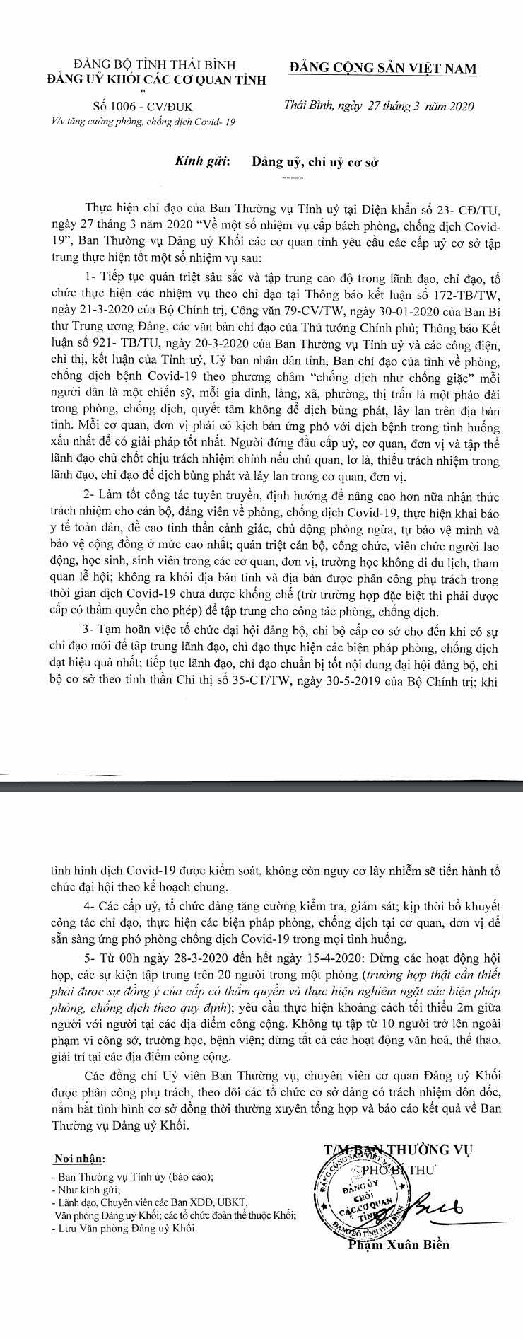 Ngày 27/3/2020, Đảng ủy Khối các cơ quan tỉnh ban hành Văn bản số 1006 - CV/ĐUK về việc phòng, chống dịch Covid-19.