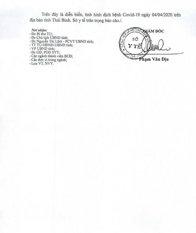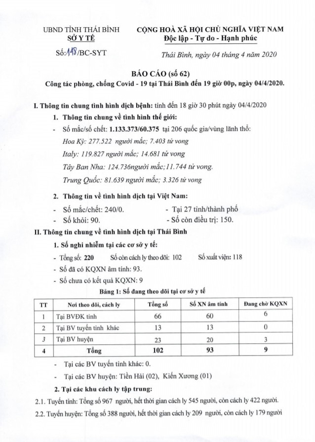 Ngày 4/4, Sở Y tế có báo cáo số 148/BC-SYT về công tác phòng, chống dịch Covid-19 tại Thái Bình đến 19h00p, ngày 04/4/2020.