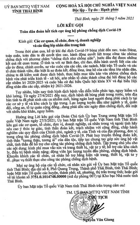 Sáng ngày 27/5, Ủy ban Trung ương MTTQ Việt Nam tổ chức trực tuyến lễ phát động đợt cao điểm quyên góp ủng hộ phòng, chống dịch Covid-19. Tại điểm cầu Thái Bình, Ủy ban MTTQ tỉnh đã tiếp nhận 500 triệu đồng của Ngân hàng Nông nghiệp và Phát triển nông thôn Việt Nam chi nhánh tỉnh Thái Bình ủng hộ công tác phòng, chống Covid-19.