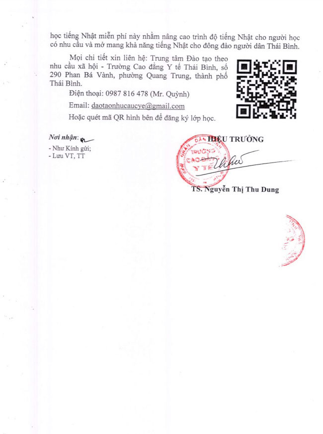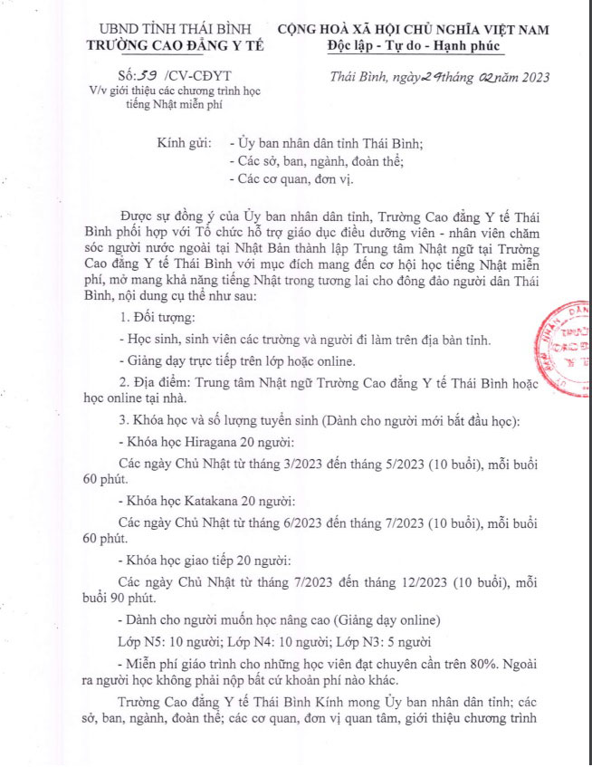 Công văn của Trường Cao đẳng Y tế Thái Bình về việc giới thiệu các chương trình học tiếng Nhật miễn phí