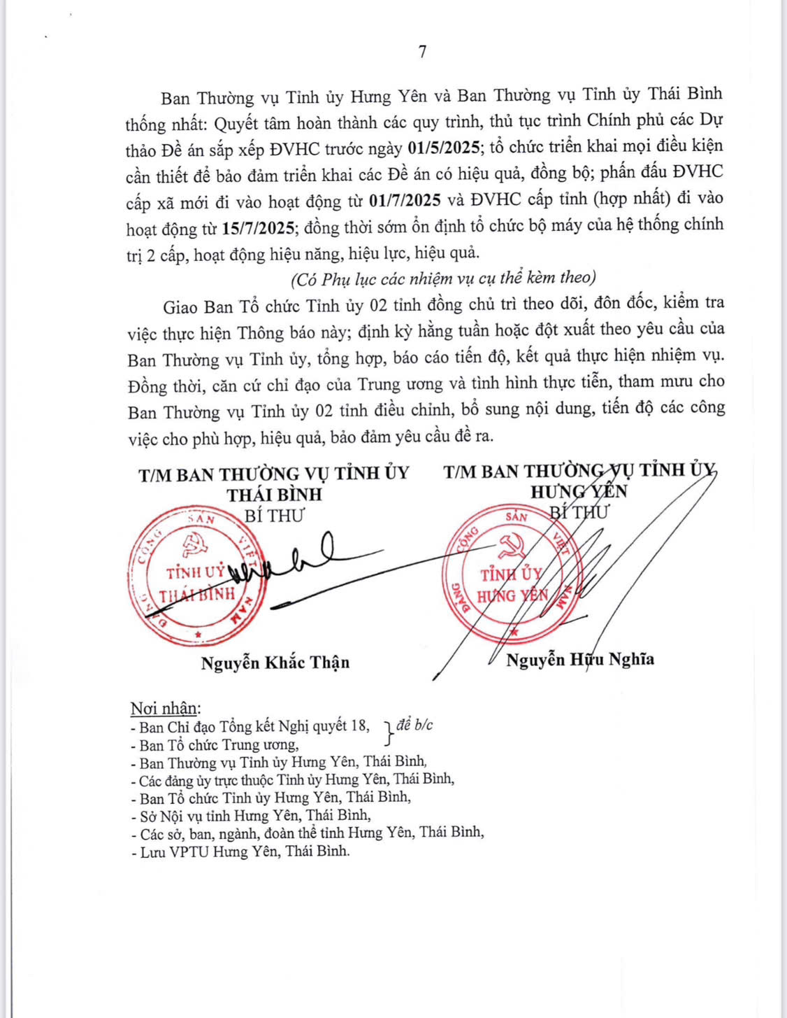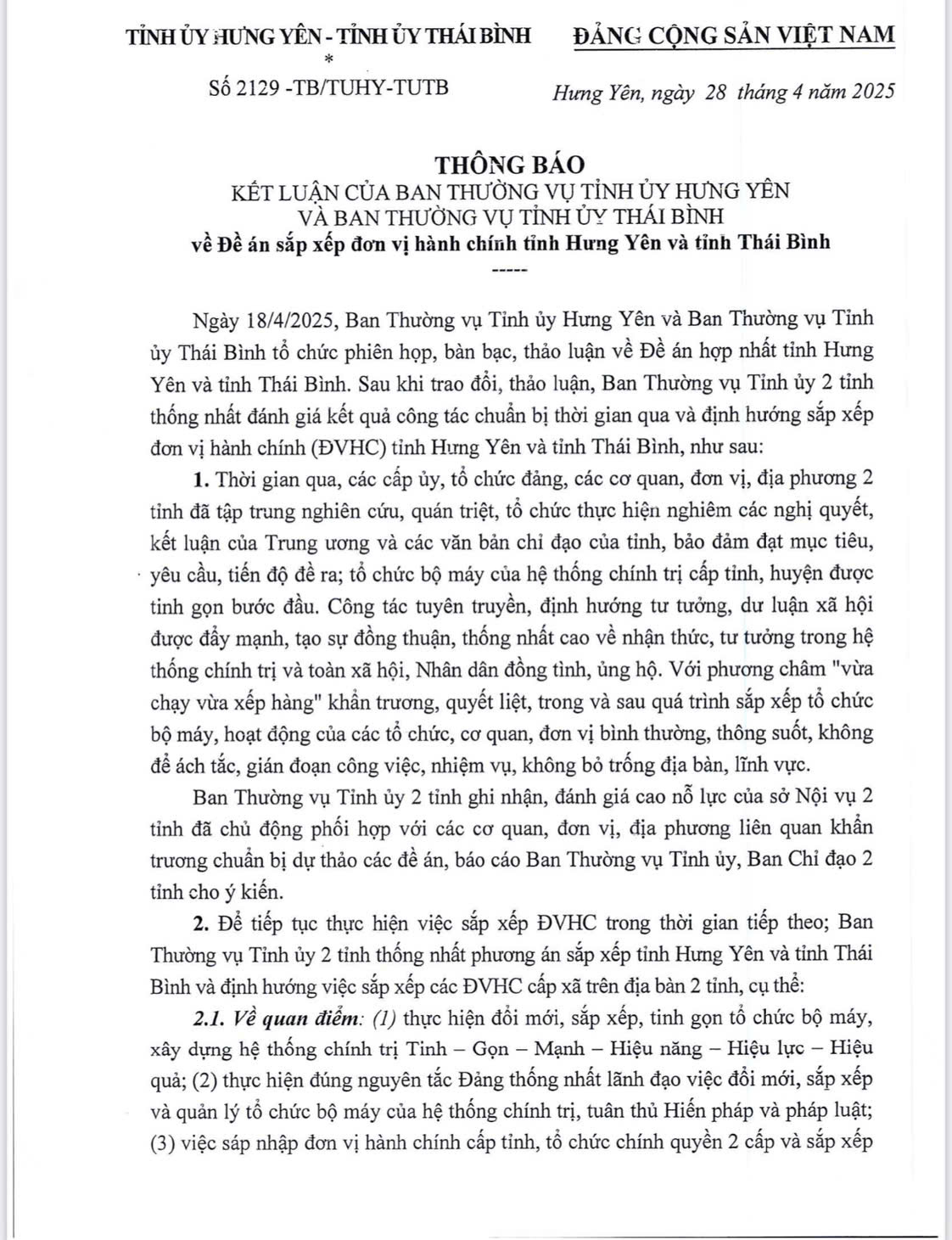 Ban Thường vụ Tỉnh ủy Hưng Yên và Ban Thường vụ Tỉnh ủy Thái Bình có Thông báo kết luận về Đề án sắp xếp đơn vị hành chính tỉnh Hưng Yên và tỉnh Thái Bình.