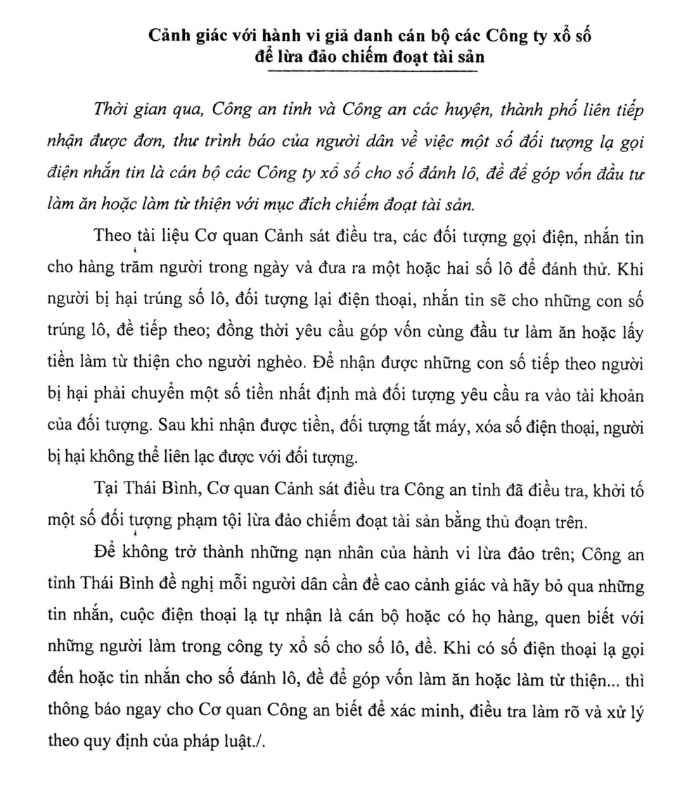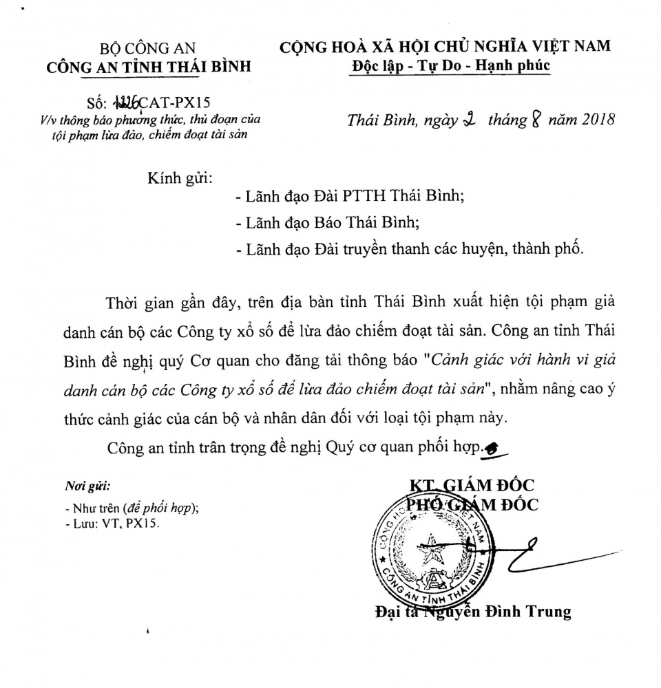 Ngày 2/8/2018, Công an tỉnh Thái Bình có Công văn số 1226 CAT - PX15 về việc thông báo phương thức, thủ đoạn của tội phạm lừa đảo, chiếm đoạt tài sản gửi lãnh đạo Đài PTTH Thái Bình, Báo Thái Bình, Đài truyền thanh các huyện, thành phố.