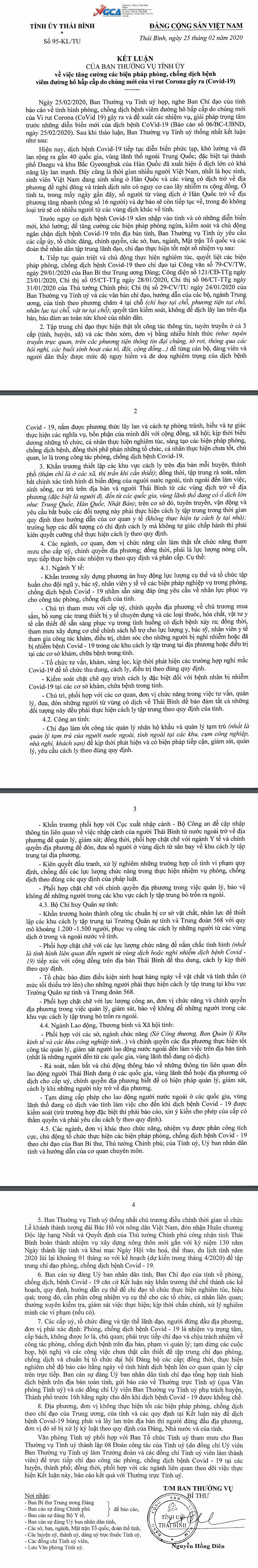 Ngày 25/2, Ban Thường vụ Tỉnh uỷ có Kết luận số 95-KL/TU về việc tăng cường các biện pháp phòng, chống dịch bệnh viêm đường hô hấp cấp do chủng mới của vi rút Corona gây ra (Covid-19). Nội dung như sau: