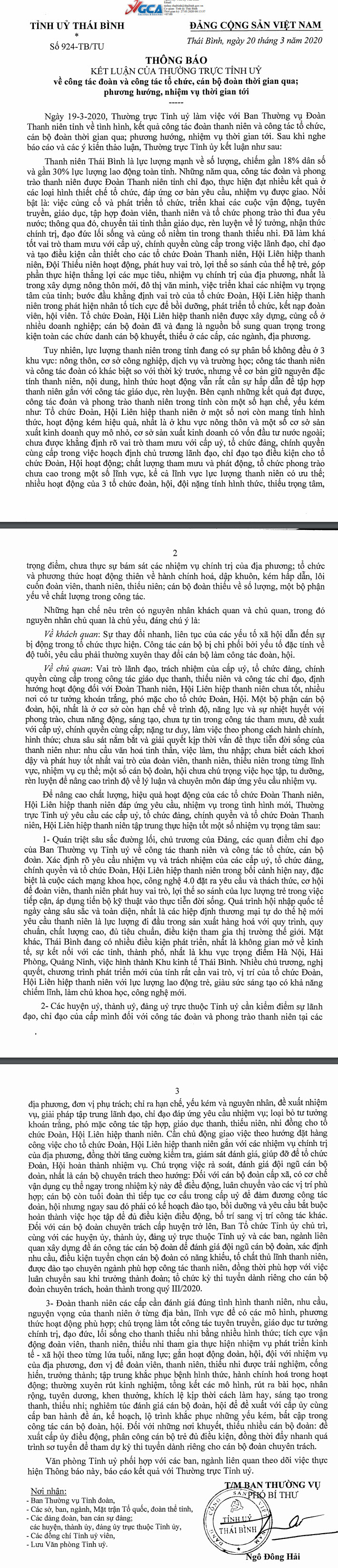 Ngày 20/3/2020, Tỉnh ủy Thái Bình ra Thông báo số 924-TB/TU kết luận của Thường trực Tỉnh ủy về công tác đoàn và công tác tổ chức, cán bộ đoàn thời gian qua; phương hướng, nhiệm vụ thời gian tới.