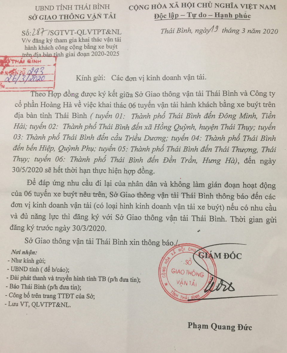 Ngày 19/3/2020, Sở Giao thông Vận tải ra Công văn số 287/SGTVT-QLVTPT&NL về việc đăng ký tham gia khai thác vận tải hành khách công cộng bằng xe buýt trên địa bàn tỉnh giai đoạn 2020 - 2025.