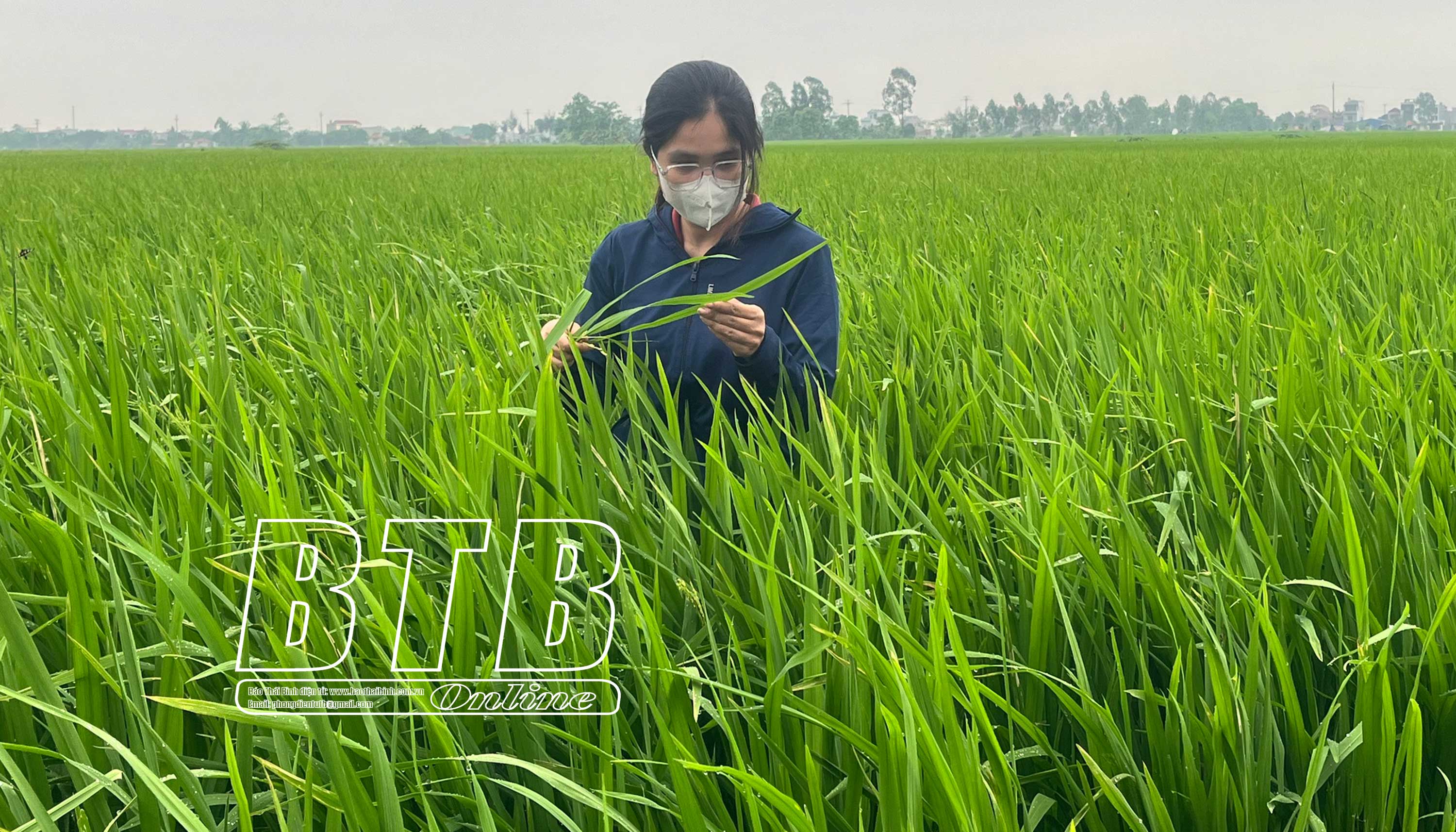 Cán bộ Trạm Trồng trọt và Bảo vệ thực vật huyện Hưng Hà kiểm tra tình hình sâu bệnh trên lúa xuân.