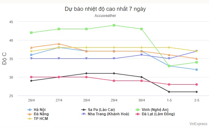 Trang Accuweather của Mỹ dự báo nhiệt độ Hà Nội sẽ đạt đỉnh 38 độ C vào ngày mai, ba ngày sau duy trì ngưỡng 37 độ, ban đêm 26-28 độ. Điểm cao trên 1.500 m so với mực nước biển như Sa Pa (Lào Cai) dịp nghỉ lễ dao động 19-31 độ C.