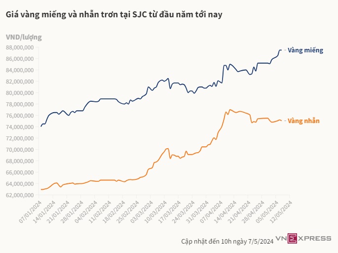 Sáng 8/5, Ngân hàng Nhà nước đấu thầu 16.800 lượng vàng miếng SJC với giá sàn (giá tối thiểu các đơn vị trả khi dự thầu) là 86,05 triệu một lượng vàng miếng SJC.