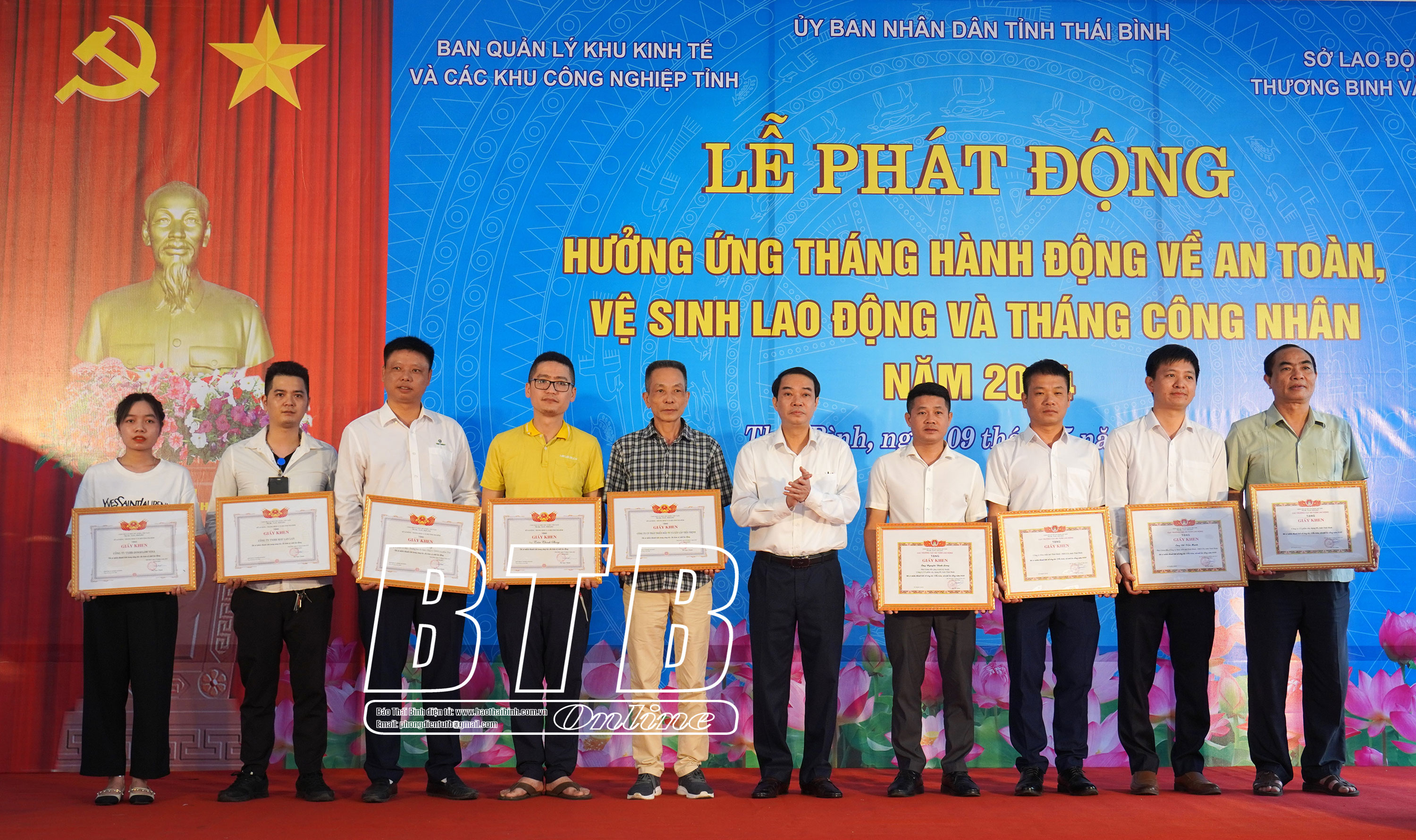 Sáng ngày 9/5, tại Công ty Cổ phần Phát triển đầu tư và xây lắp Tiến Thịnh, khu công nghiệp Phúc Khánh (thành phố Thái Bình), Sở Lao động - Thương binh và Xã hội tổ chức lễ phát động hưởng ứng tháng hành động về an toàn, vệ sinh lao động (ATVSLĐ) và tháng công nhân năm 2024. Dự lễ phát động có đồng chí Lại Văn Hoàn, Tỉnh ủy viên, Phó Chủ tịch UBND tỉnh.