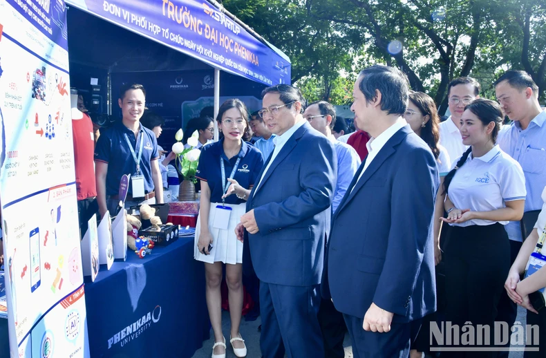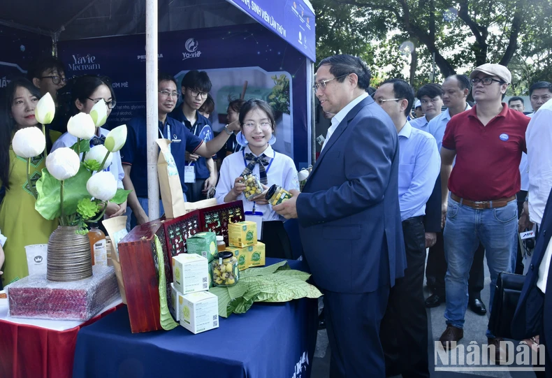 * Trước giờ khai mạc, Thủ tướng Phạm Minh Chính đã đi thăm một số gian hàng trình bày ý tưởng khởi nghiệp của sinh viên một số trường đại học.