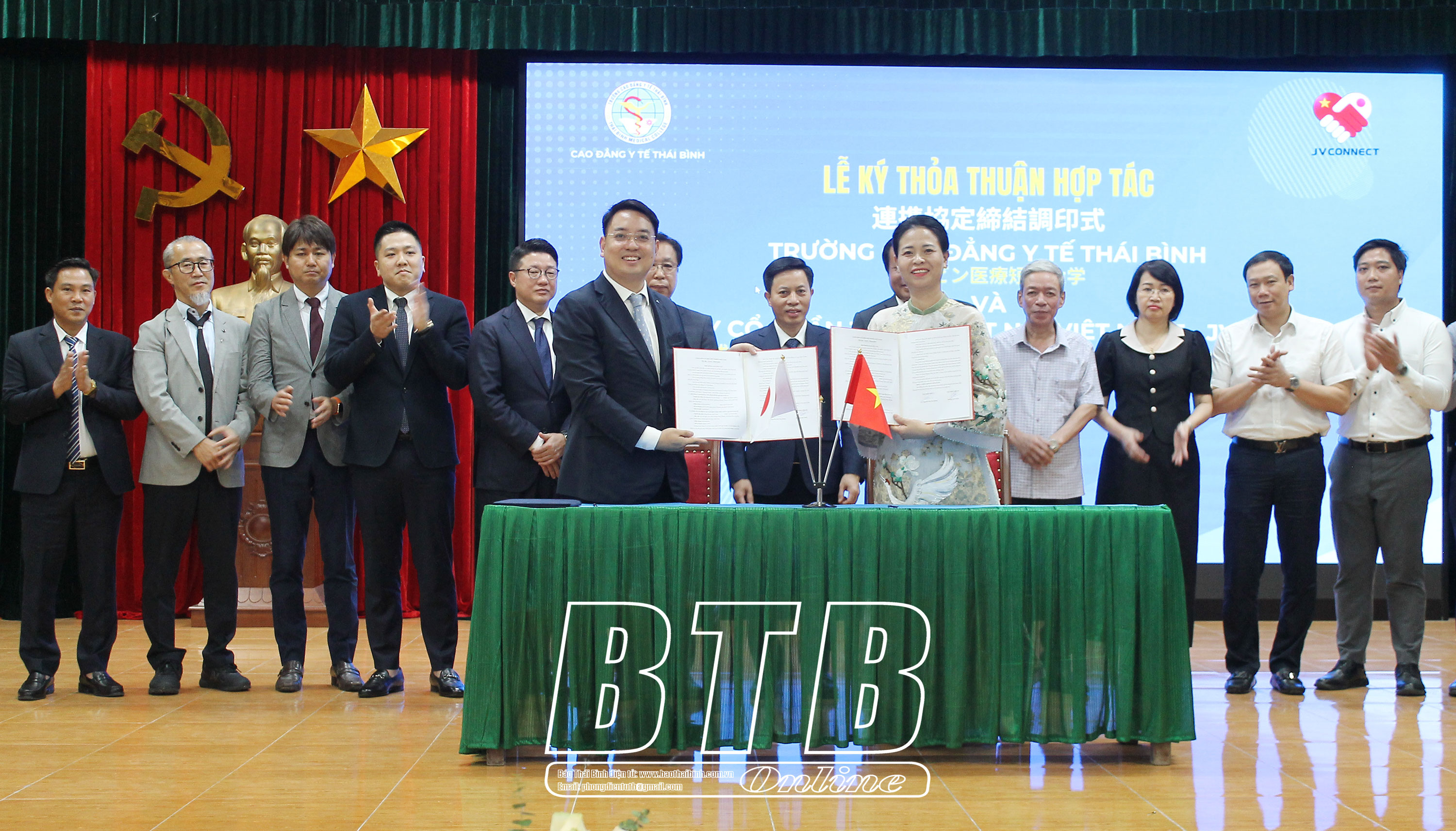 Tại buổi lễ, đồng chí Phó Chủ tịch UBND tỉnh và các đồng chí lãnh đạo một số sở, ngành, đơn vị của tỉnh đã chứng kiến lễ ký kết thỏa thuận hợp tác giữa Trường CĐYT Thái Bình với Trường Đại học Hokkaido Bunkyo; Trường CĐYT Thái Bình với Công ty Cổ phần Tư vấn kết nối Việt Nhật - JV Connect.