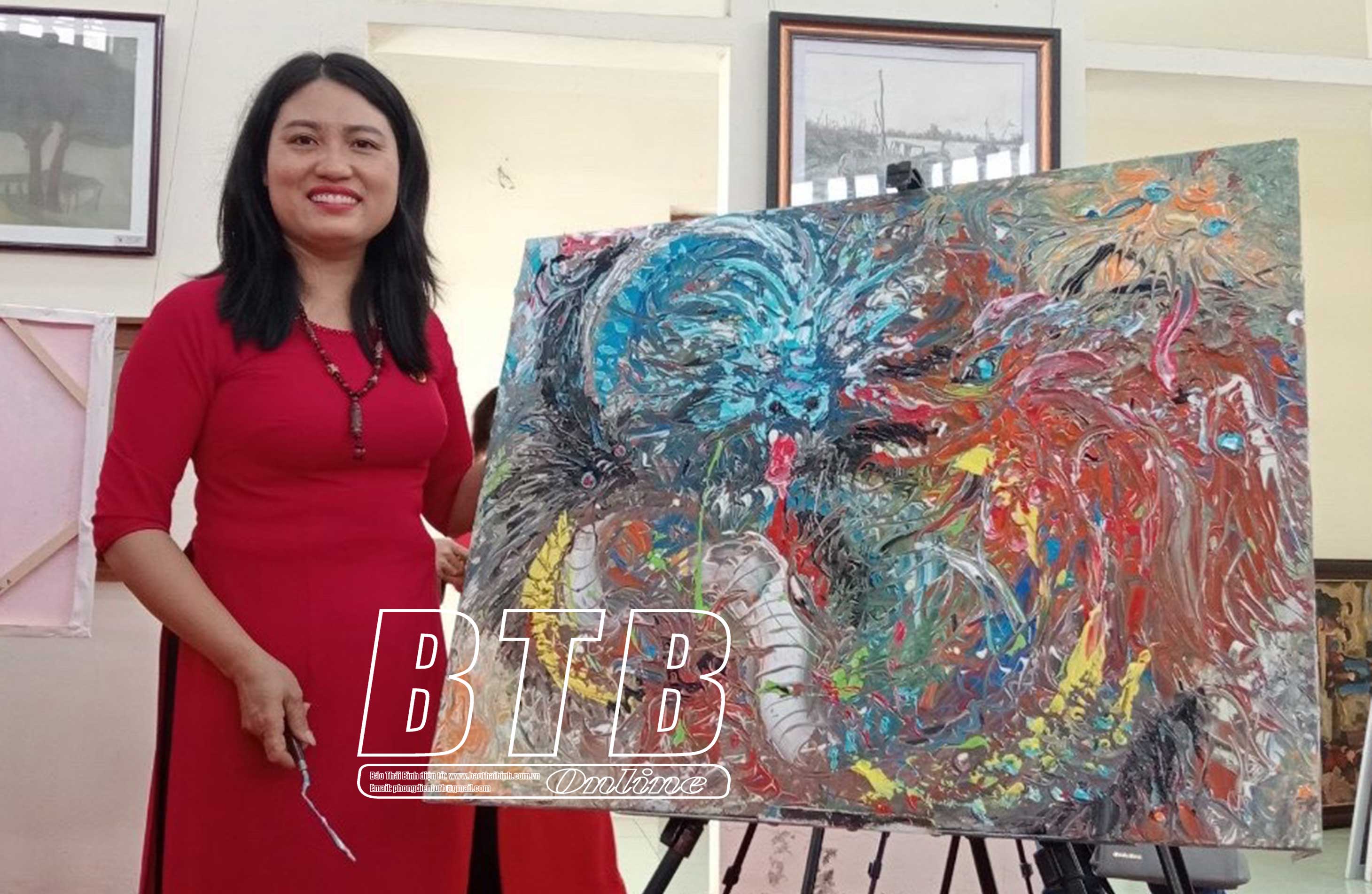 Cô giáo Ngô Thị Mến, Trường Tiểu học Nguyên Xá (Vũ Thư) bên tác phẩm hội họa của mình.