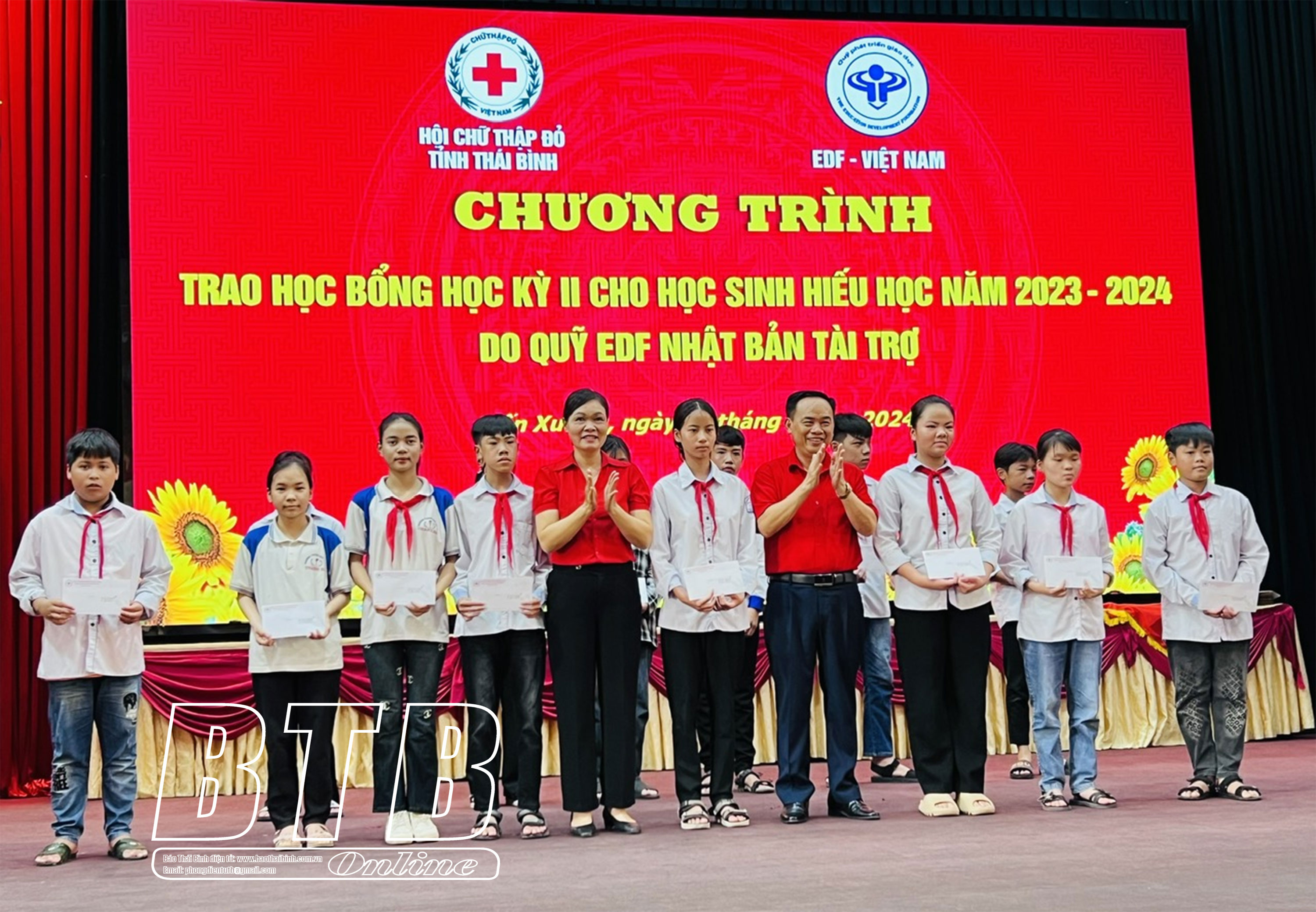 Lãnh đạo Hội Chữ thập đỏ tỉnh và Hội Chữ thập đỏ huyện Kiến Xương trao học bổng cho học sinh có hoàn cảnh khó khăn.