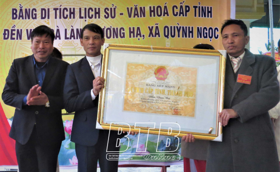 Thừa ủy quyền của Chủ tịch UBND tỉnh, lãnh đạo UBND huyện Quỳnh Phụ trao bằng di tích lịch sử văn hóa cấp tỉnh đền Vua Bà.