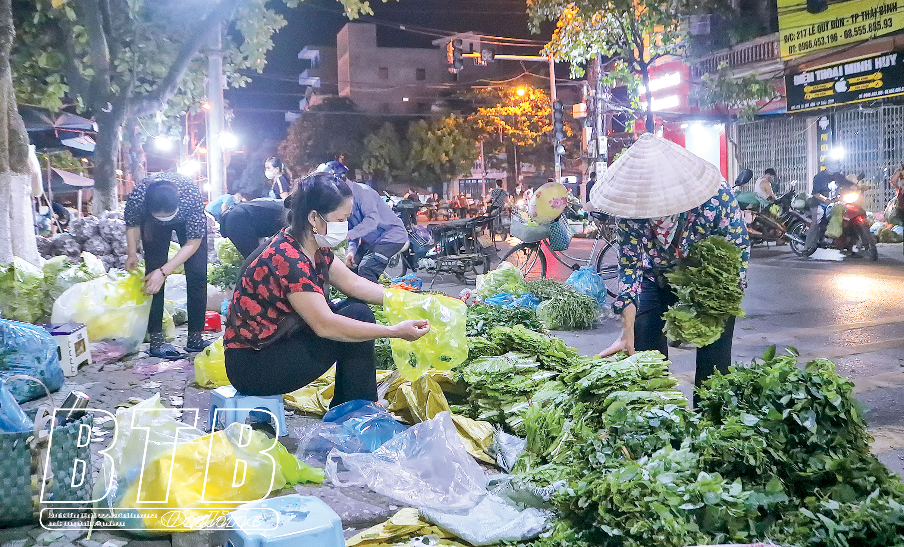 Qua hàng hoa Tuyền Phượng, chị Nguyễn Thị Hường đang cắm những đĩa hoa lễ để kịp giao hàng sáng. Vừa tỉ mỉ chọn hoa, cắt tỉa, chị Hường chia sẻ: Chợ hoa đêm có từ lâu rồi, trước tôi cũng hay đi chợ mua hoa về chơi, rồi bén duyên, mở cửa hàng từ năm 1998, phục vụ hoa tươi cho người chơi thường nhật và hoa lễ. Ngoài các loại hoa của những làng vườn nổi tiếng trong tỉnh, cửa hàng còn nhập thêm hoa cao cấp từ tỉnh ngoài để phục vụ người tiêu dùng. Trước ảnh hưởng của dịch Covid-19, xe vận tải tỉnh ngoài khó lưu thông nên sản phẩm của các làng vườn trong tỉnh nhiều thời điểm cháy hàng; tuy nhiên ở đây mua bán đã thành quen, lấy công làm lãi nên không có tình trạng ép giá hay hét giá. Còn với cô Đặng Thị Vui, xã Bách Thuận (Vũ Thư) cũng hơn 15 năm theo chợ, sản phẩm chủ lực vẫn là hoa vườn, tuy không hào nhoáng, cầu kỳ và giá không cao như hoa nhập ngoại tỉnh nhưng hoa vườn bình dân, dễ làm, dễ bán, không kén khách mua. Thỉnh thoảng vườn nhà cô cũng góp thêm buồng chuối, mớ rau cho tăng thu nhập. Chị em ở chợ đêm tuy mỗi người một quê nhưng mua bán lâu năm thành bó bện, đoàn kết. Thương nhất những ngày mưa đông giá rét, chị em ngồi quây quần chia sẻ chuyện gia đình, truyền hơi ấm cho nhau, nhẫn nại nhìn đêm chỉ mong mau hết hàng để được về sớm, hôm nào không thấy đi chợ lại nhớ nhau. Lúc buổi chợ hàng dọn đầy vỉa hè nhưng khi hết hàng, tan chợ chị em đều nhắc nhở nhau dọn dẹp gọn gàng để trả lại phố phường sạch sẽ. Có hàng hoa nho nhỏ, tần tảo bao năm chắt chiu mà vun vén được cho gia đình, nuôi dạy con cái trưởng thành, giờ nghỉ một ngày cũng nhớ chợ lắm.