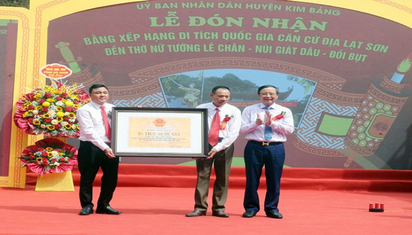 Thừa ủy quyền của Bộ trưởng Văn hóa, Thể thao và Du lịch, đồng chí Nguyễn Đức Vượng, Phó Chủ tịch UBND tỉnh Hà Nam trao Bằng xếp hạng Di tích quốc gia Căn cứ địa Lạt Sơn cho cán bộ, nhân dân huyện Kim Bảng.