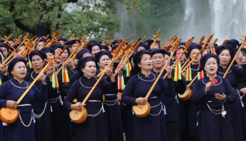 Nghệ nhân mặc trang phục đặc trưng của dân tộc mình biểu diễn hát Then, đàn Tính