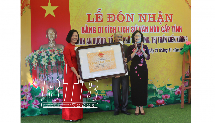 Lãnh đạo Sở Văn hóa - thể thao và Du lịch trao bằng di tích lịch sử văn hóa cấp tỉnh đình An Dưỡng.