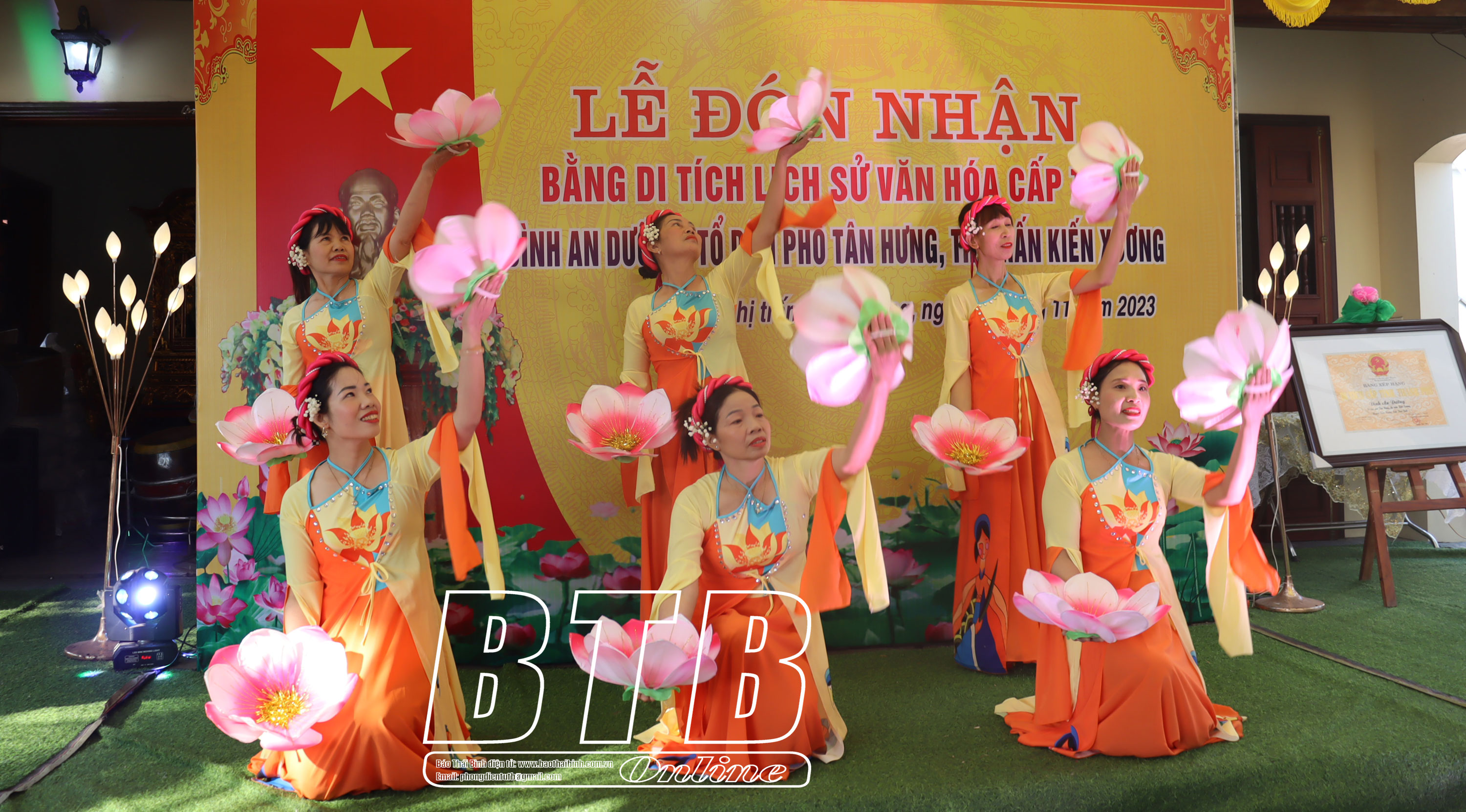 Người dân tổ dân phố Tân Hưng biểu diễn văn nghệ trong lễ đón nhận bằng di tích lịch sử văn hóa cấp tỉnh đình An Dưỡng.
