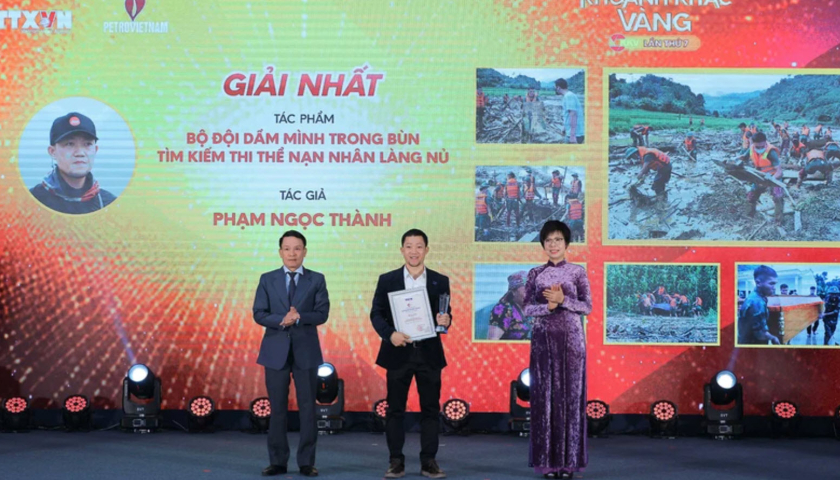 Tác phẩm “Thủ tướng Chính phủ Phạm Minh Chính lội bùn chỉ đạo tìm kiếm nạn nhân bị vùi lấp ở Làng Nủ” của tác giả Lê Đức Phương được trao giải nhì ảnh đơn.