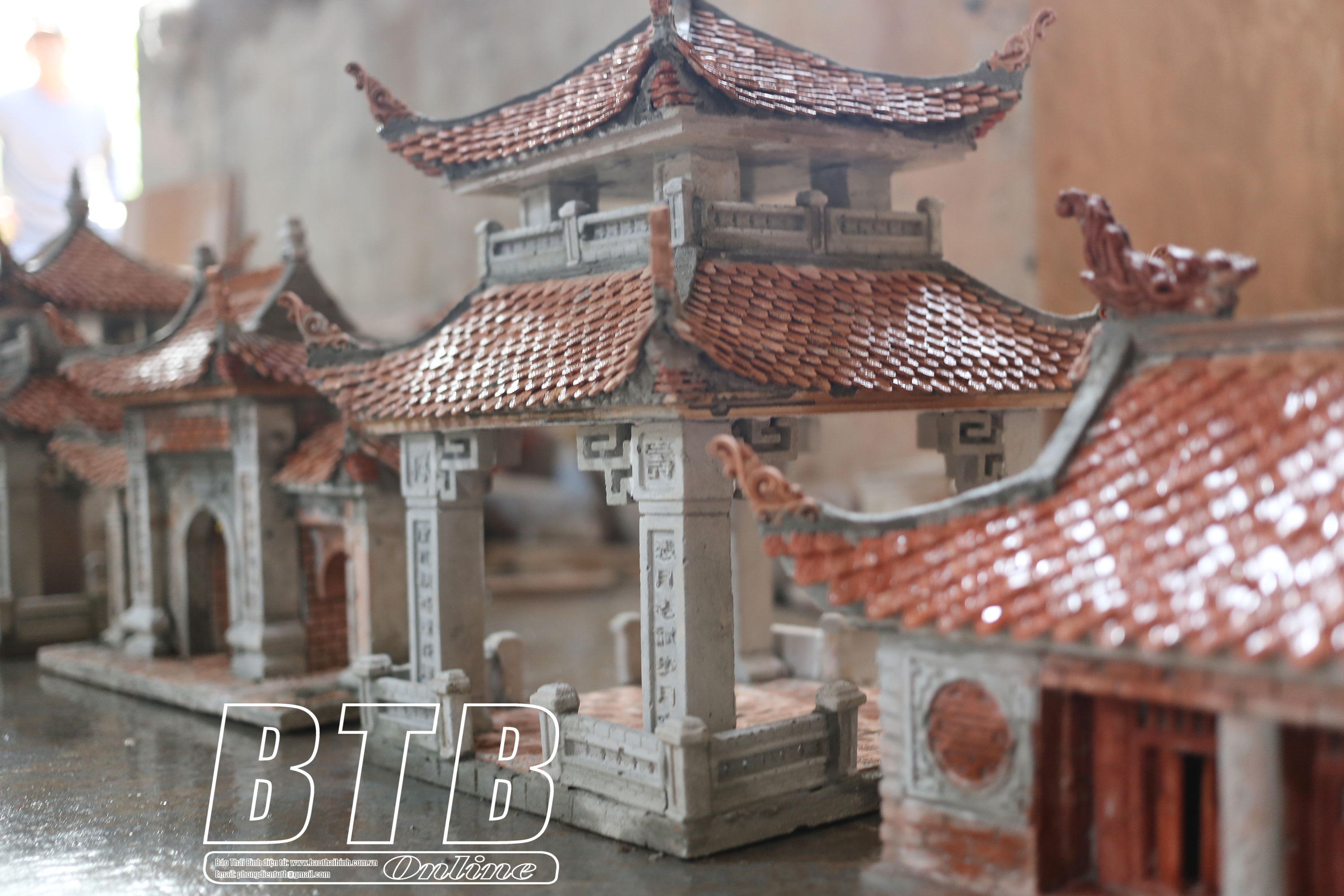Các công trình thu nhỏ được chế tác tỉ mỉ, từ mái ngói uốn cong, cột trụ đến các hoa văn trang trí, tạo nên vẻ đẹp chân thực và sống động.