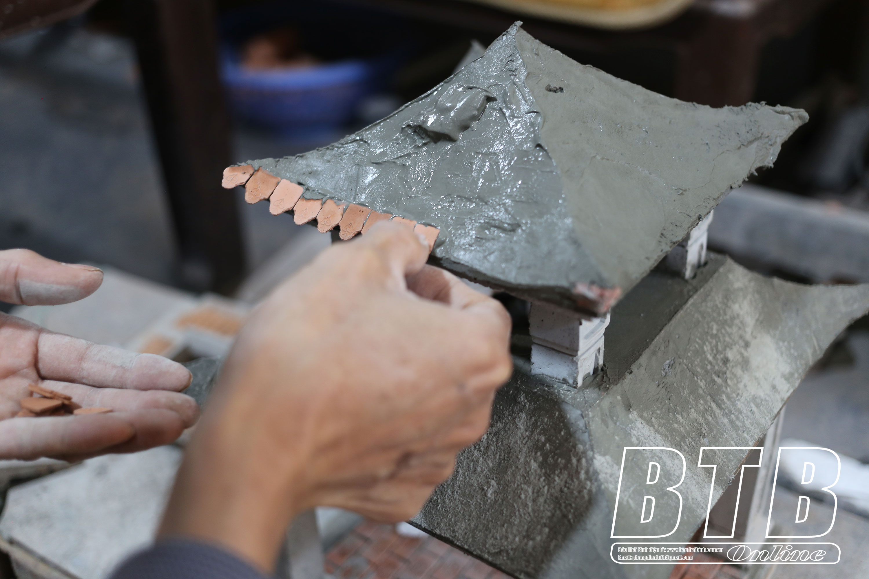 Khâu làm mái ngói đòi hỏi người thợ phải cẩn trọng và tỉ mỉ khi ghép từng mảnh ngói lại với nhau.