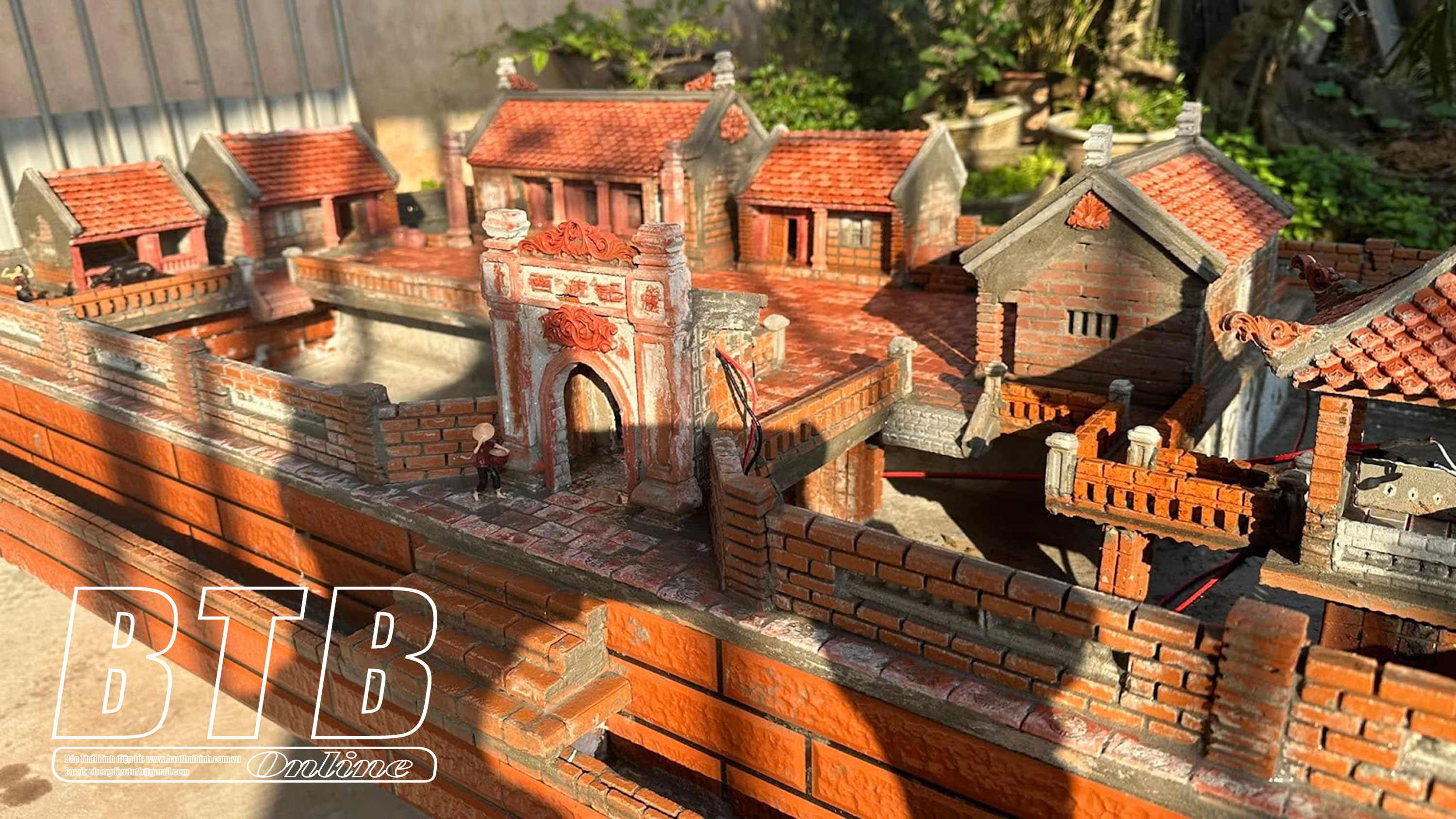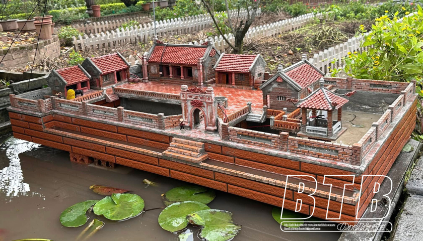 Mô hình tiểu cảnh làng quê tái hiện sinh động kiến trúc truyền thống với cổng làng, đình chùa, ao nước và những nếp nhà cổ.