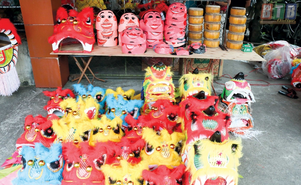 Hàng năm, gia đình ông Tý làm mặt hàng này từ tháng 3 âm lịch, khi đó chỉ làm khung và dán giấy. Đến tháng 9, tháng 10 âm lịch, gia đình ông mới đem ra phơi khô và quét sơn bởi theo như chia sẻ của ông Tý, nếu quét sơn ngay từ tháng 3 thì khi đến mùa trung thu, giấy sẽ bị bạc màu. Điều đặc biệt, cứ mỗi độ hè về, ngày nào cũng có hàng chục học sinh trong thôn, trong xã đến nhà ông tham gia làm mặt nạ và đầu sư tử. Cháu thì khâu vá, cháu bôi hồ dán, cháu quét sơn. Các sản phẩm của gia đình ông không chỉ được bán cho các hộ dân trong xã, trong huyện và tỉnh mà còn cung cấp cho thị trường các tỉnh lân cận như Hải Phòng, Thanh Hóa…