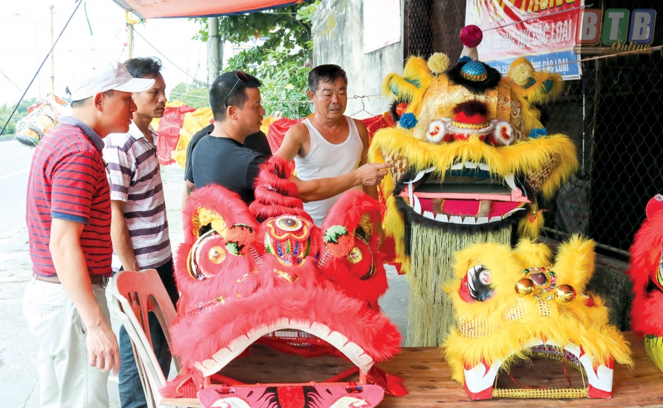 Trong cái rộn ràng của mùa tết thiếu nhi, chúng tôi đến gia đình anh Vũ Ngọc Hòa và gia đình anh Phạm Minh Chiều, thôn Mỹ Bổng, xã Việt Hùng. Từ xa, chúng tôi đã nghe tiếng trống, tiếng kẻng tùng tùng, keng keng... Những đèn ông sao được trang trí khắp từ cổng vào trong nhà trông rất bắt mắt. Nếu chỉ nhìn vào những sản phẩm đầu lân của các gia đình, ít ai có thể đoán ra rằng đây lại là sản phẩm của những người nông dân bởi đường nét và màu sắc rất hài hòa. Những “chú lân” đã hoàn thành được xếp cẩn thận, ngay ngắn trên kệ. Mặc chiếc áo còn đọng màu sơn, anh Chiều tỉ mẩn làm tiếp những chiếc đầu lân để kịp chuẩn bị cho các cháu vui trung thu.
