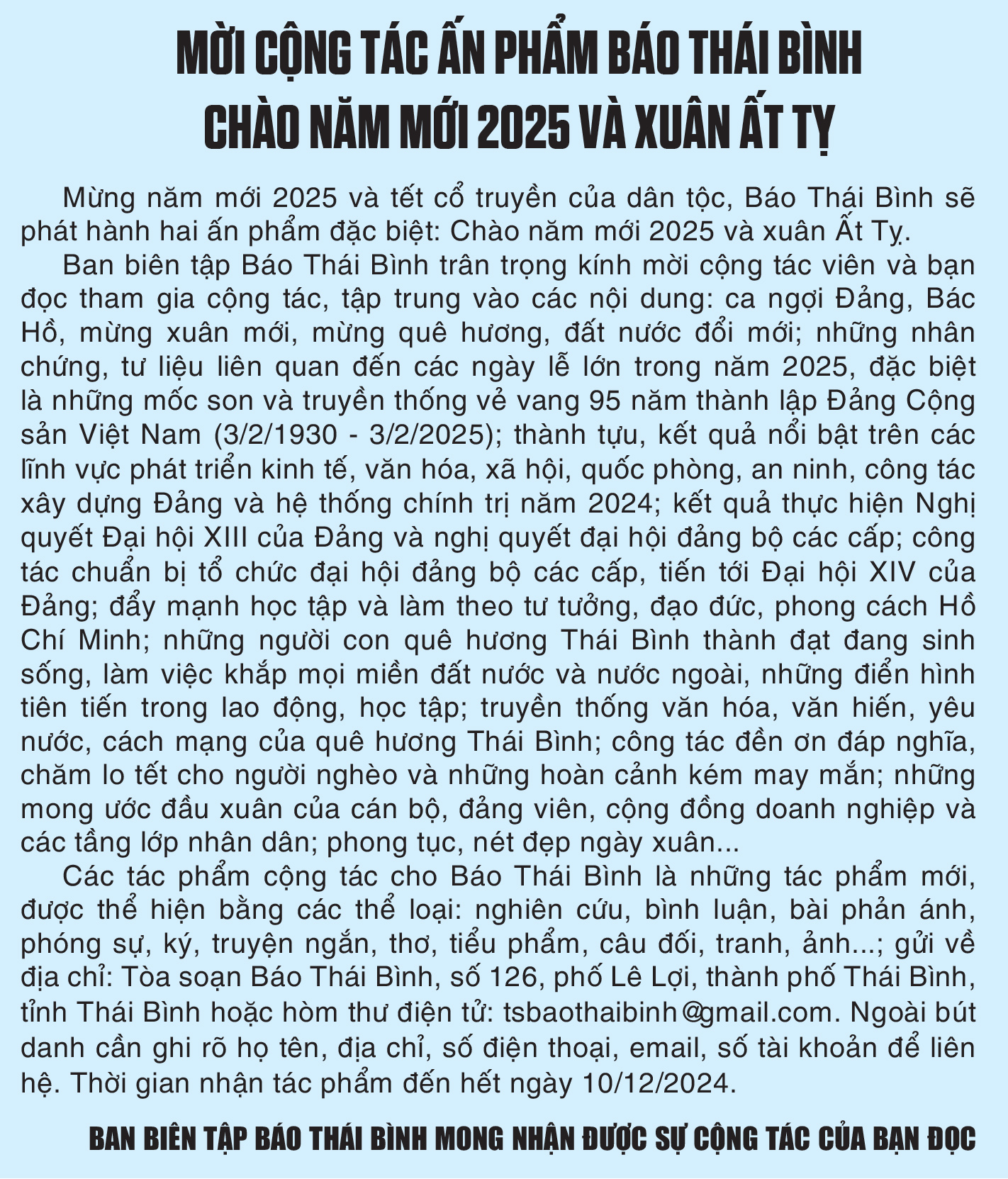 Mời cộng tác ấn phẩm Báo Thái Bình chào năm mới 2025 và xuân ẤT Tỵ
