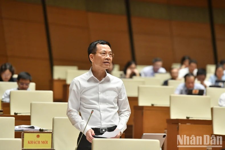 Bộ trưởng Thông tin và Truyền thông Nguyễn Mạnh Hùng phát biểu giải trình, làm rõ một số nội dung đại biểu Quốc hội nêu. (Ảnh: ĐĂNG KHOA).