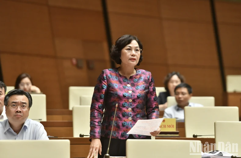 Thống đốc Ngân hàng Nhà nước Việt Nam Nguyễn Thị Hồng phát biểu giải trình, làm rõ một số nội dung đại biểu Quốc hội nêu tại phiên họp. (Ảnh: ĐĂNG KHOA).