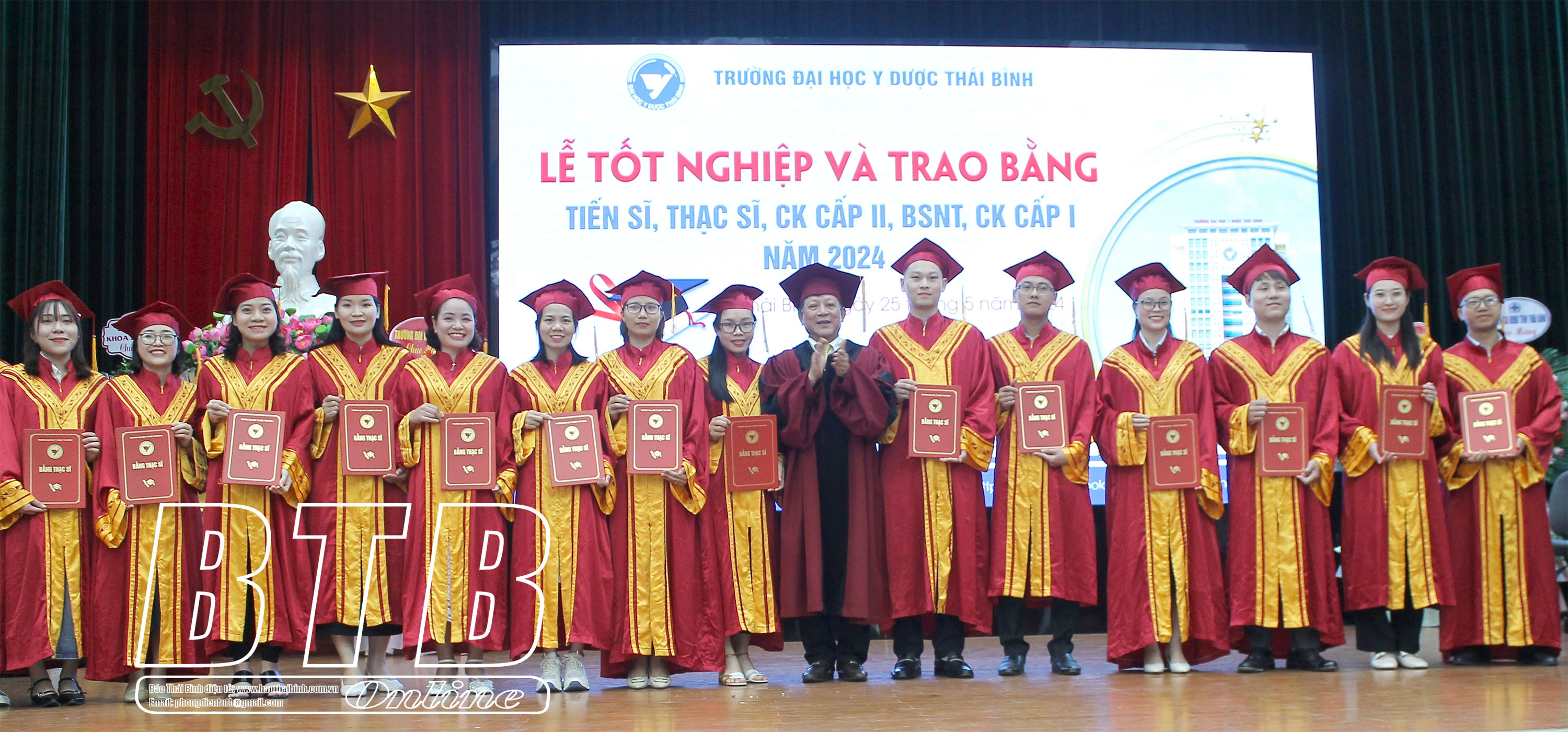 Chiều ngày 25/5, Trường Đại học Y Dược Thái Bình tổ chức lễ tốt nghiệp và trao bằng tiến sĩ, thạc sĩ, bác sĩ chuyên khoa cấp II, bác sĩ nội trú, bác sĩ chuyên khoa cấp I năm 2024.