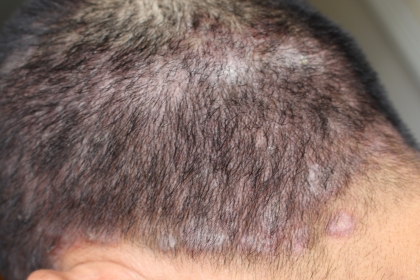 Nhớ lại những tháng ngày vảy mọc đầy người, ông Trạch không khỏi rùng mình, ông tâm sự: “Khoảng năm 1972 là tôi bắt đầu bị vảy nến rồi. Mới đầu, tôi chỉ bị vảy nến da đầu và quanh khu vực từ cổ gáy trở lên thôi. Có mấy bãi vảy nến trên đầu thôi là đã khiến tóc bết dính và ngứa ngáy phải “bận chân, bận tay” suốt, lúc nào cũng phải thò tay lên gãi. Khi gãi thì vảy bong ra nhiều lắm, lấm tấm như cám. Thi thoảng vảy nến còn lan ra vùng rìa tóc, khu vực trán, tai, cổ, gáy… thì ai nhìn vào là thấy luôn nên khá ngại.”