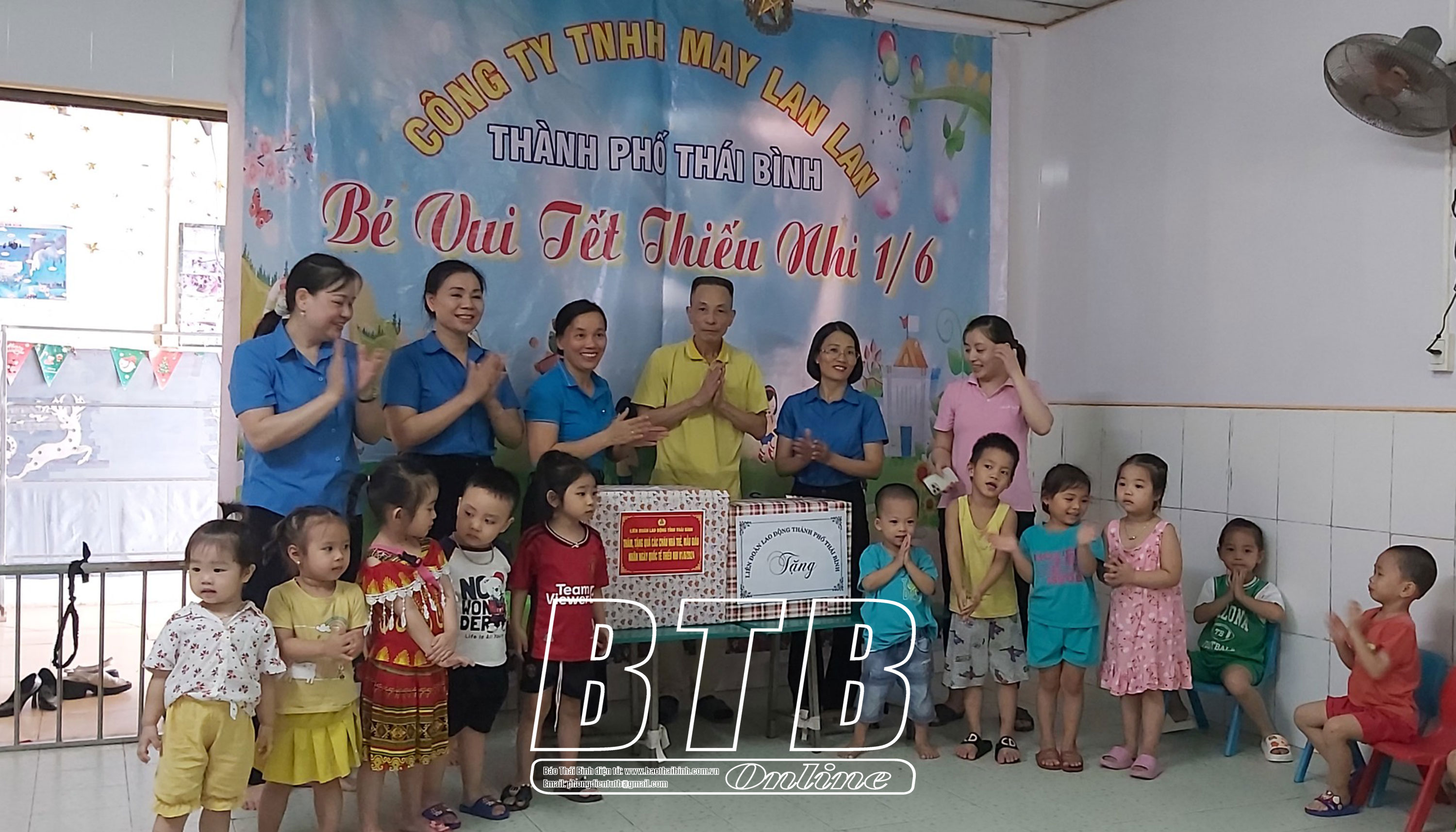 Liên đoàn Lao động tỉnh đã đến thăm, tặng quà các cháu thiếu nhi tại Làng trẻ em SOS Thái Bình, nhà trẻ Công ty TNHH May Lan Lan và 4 trường mầm non trên địa bàn thành phố Thái Bình gồm: Trường Mầm non 1/6 - Lê Hồng Phong, Trường Mầm non Phú Xuân, Trường Mầm non Phú Khánh, Trường Mầm non Hoa Hồng. Tổng các phần quà trị giá 12 triệu đồng.