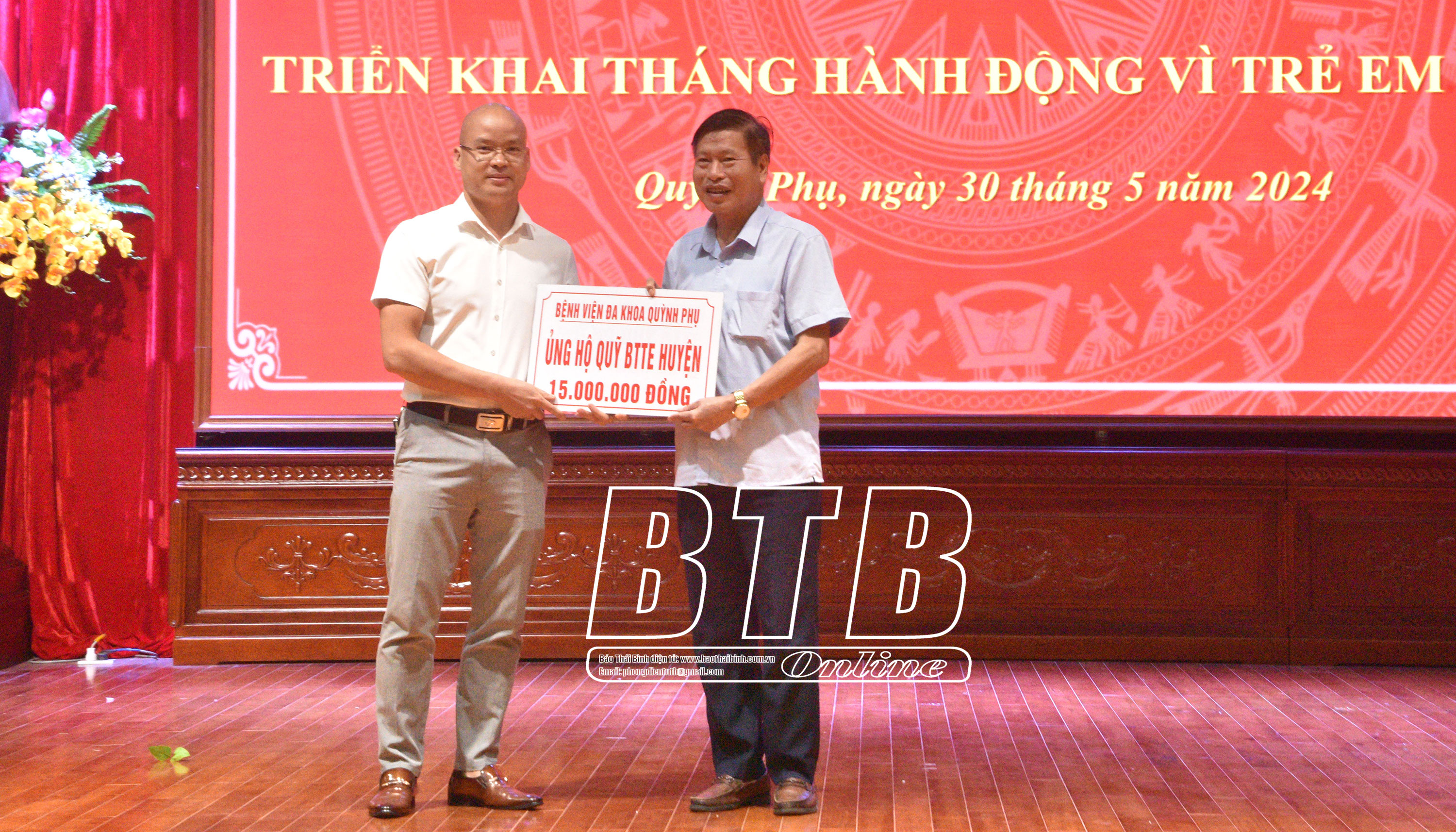 Bệnh viện Đa khoa huyện Quỳnh Phụ trao biểu trưng ủng hộ kinh phí cho quỹ bảo trợ trẻ em huyện.