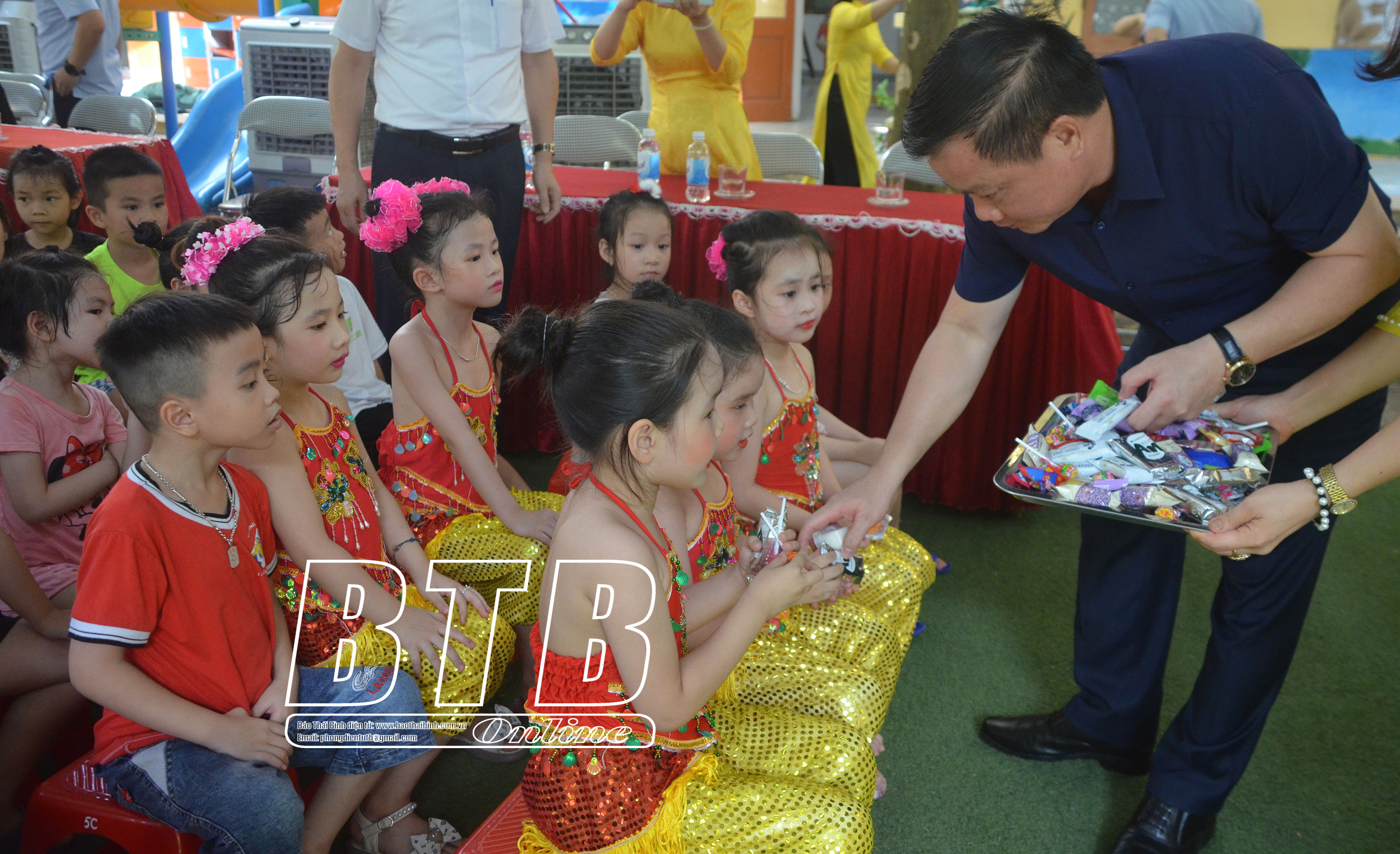 Đồng chí Nguyễn Khắc Thận, Phó Bí thư Tỉnh ủy, Chủ tịch UBND tỉnh; lãnh đạo thành phố và Sở Lao động – Thương binh và Xã hội tặng các cháu thiếu nhi Trường Mầm non 1/6 - Lê Hồng Phong.