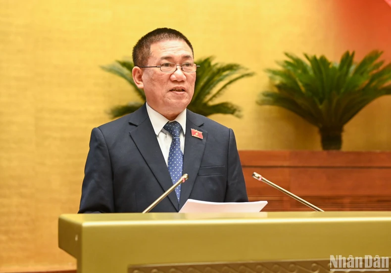 Bộ trưởng Tài chính Hồ Đức Phớc báo cáo tại phiên họp. (Ảnh: DUY LINH).