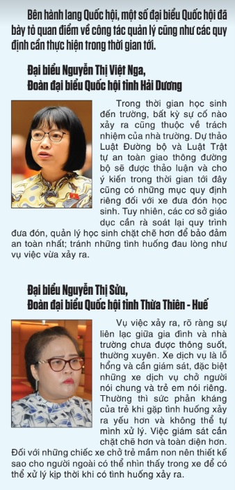 Rõ ràng, việc sớm có những quy định riêng biệt về kiểm soát an toàn đối với phương tiện đưa đón học sinh trong bối cảnh hiện nay là hết sức cần thiết. Trong lúc chờ các quy định của pháp luật liên quan được đồng bộ, ngoài hạ tầng giao thông, chất lượng phương tiện thì yếu tố con người đóng vai trò quan trọng trong công tác bảo đảm an toàn cho học sinh. Qua sự việc trên cho thấy quan tâm đến trẻ em mọi lúc, mọi nơi bằng tất cả tình thương và trách nhiệm phải là bài học thuộc lòng đối với những người thực hiện nhiệm vụ chăm sóc, nuôi dưỡng, giáo dục trẻ em. Đặc biệt, cùng với sự đầu tư nhiều hơn về chính sách và nguồn lực, cần tăng cường công tác chỉ đạo, kiểm tra, giám sát để khắc phục kịp thời những tồn tại, hạn chế của hệ thống giáo dục mầm non nói chung, trong đó có loại hình giáo dục mầm non ngoài công lập nói riêng.