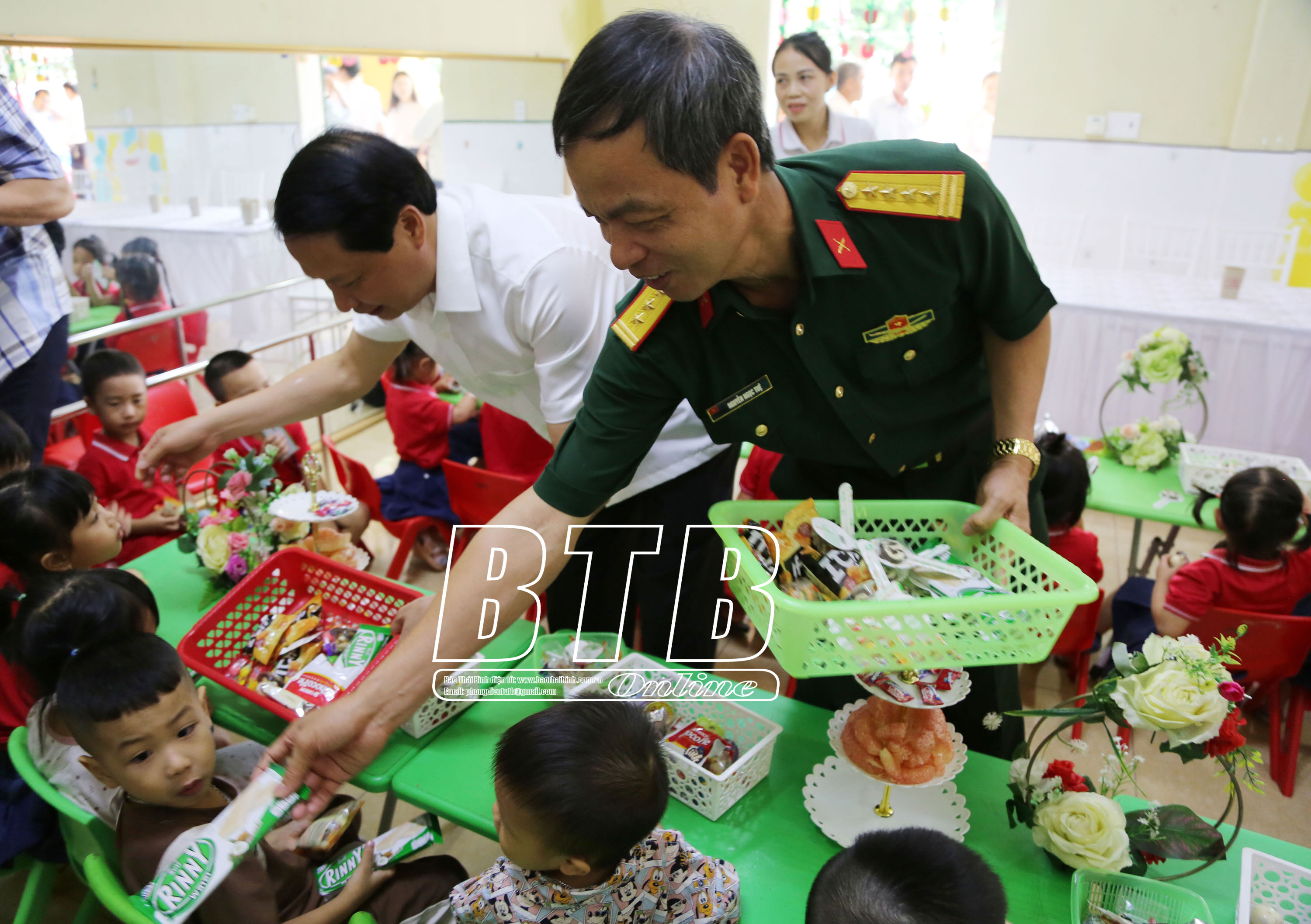 Đồng chí Hoàng Thái Phúc, Ủy viên Ban Thường vụ, Trưởng ban Nội Chính Tỉnh ủy và đồng chí Nguyễn Ngọc Tuệ, Ủy viên Ban Thường vụ, Chỉ huy trưởng Bộ Chỉ huy Quân sự tỉnh chia kẹo cho các cháu thiếu nhi Trường Mầm non An Khê cơ sở 2, xã An Khê (Quỳnh Phụ).