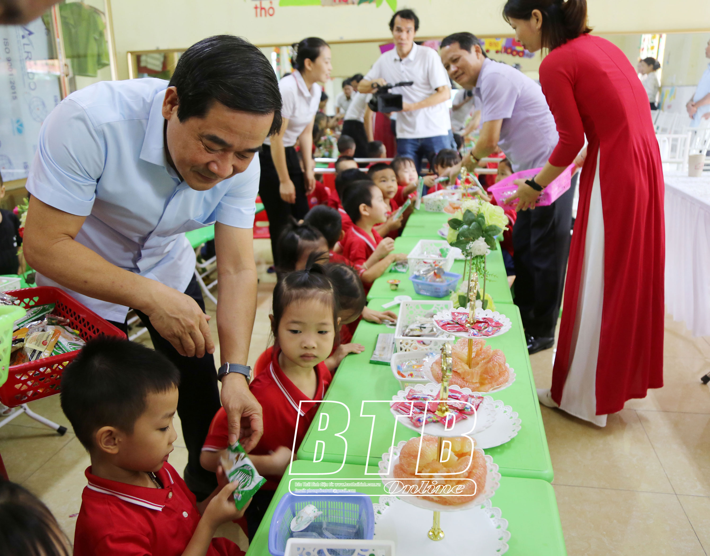 Đồng chí Nguyễn Tiến Thành, Phó Bí thư thường trực Tỉnh ủy, Chủ tịch HĐND tỉnh chia kẹo cho các cháu thiếu nhi Trường Mầm non An Khê cơ sở 2, xã An Khê (Quỳnh Phụ).