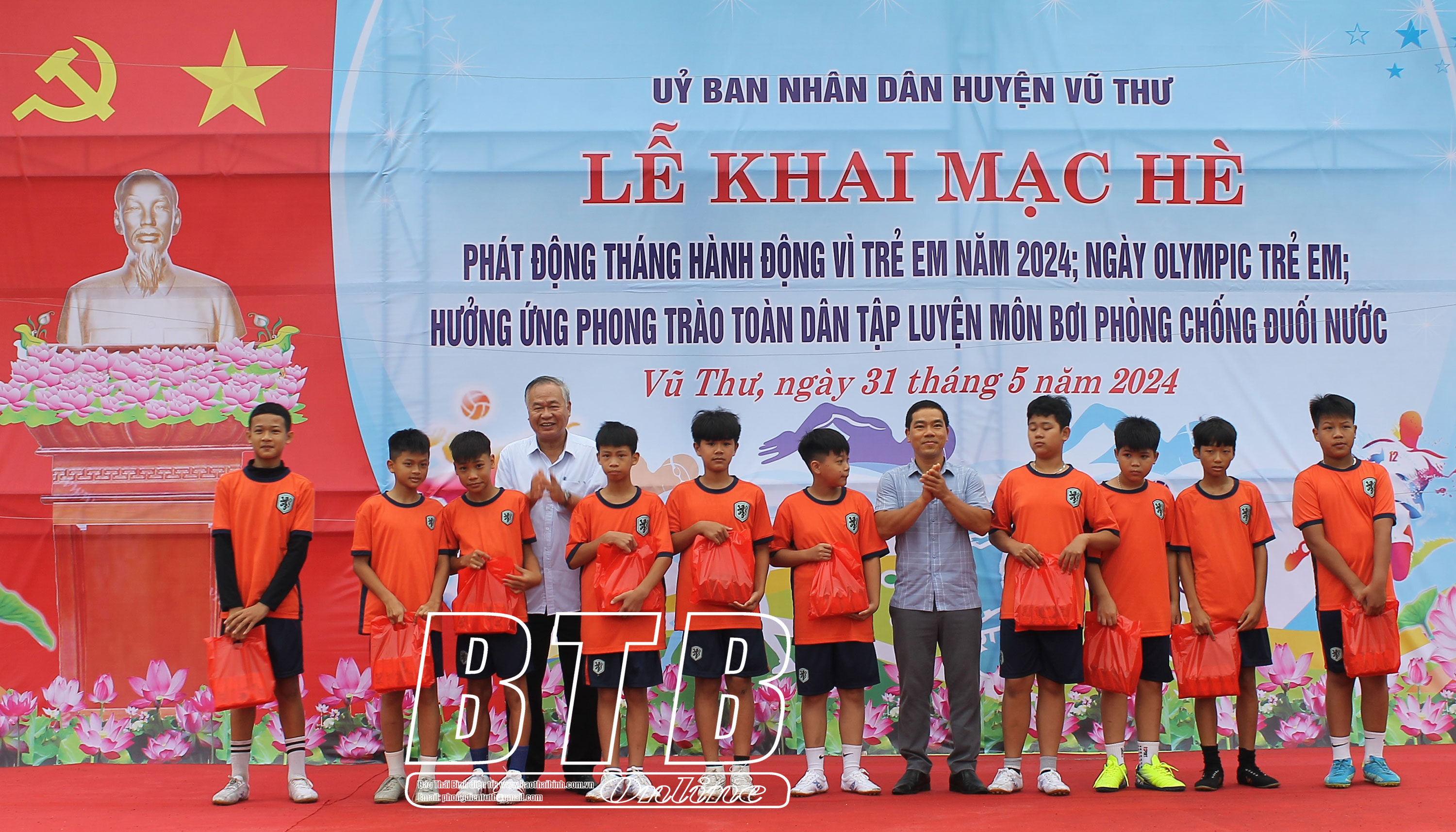 Nhân dịp này, các đồng chí lãnh đạo Sở Văn hóa, Thể thao và Du lịch, huyện Vũ Thư đã trao 30 suất quà, mỗi suất trị giá 500.000 đồng cho trẻ em có hoàn cảnh khó khăn; trao 130 suất quà và phao bơi gắn tay cho đại diện học sinh có thành tích cao trong hoạt động thể thao, học sinh đang tham gia các lớp tập huấn kỹ năng bơi lội.