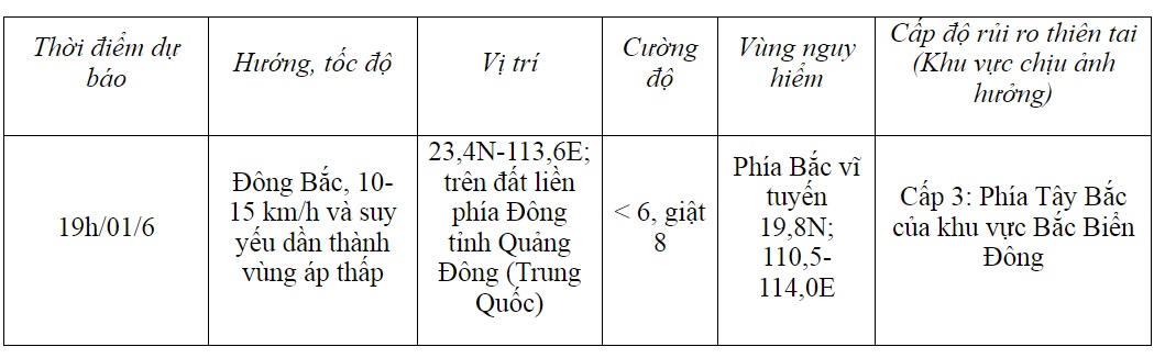 Hồi 07 giờ ngày 01/6, vị trí tâm áp thấp nhiệt đới ở vào khoảng 22,2 độ Vĩ Bắc; 112,0 độ Kinh Đông, trên đất liền phía Nam tỉnh Quảng Đông (Trung Quốc). Sức gió mạnh nhất vùng gần tâm áp thấp nhiệt đới mạnh cấp 6-7 (39-61km/h), giật cấp 9; di chuyển theo hướng Đông Bắc với tốc độ 10-15km/h.