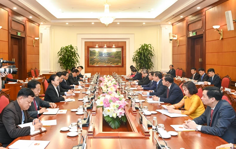 Chủ nhiệm Ủy ban Kiểm tra Trung ương Trần Cẩm Tú và Chủ nhiệm Ban Kiểm tra Trung ương Lào Khamphan Phommathat và các đại biểu . (Ảnh: DUY LINH).