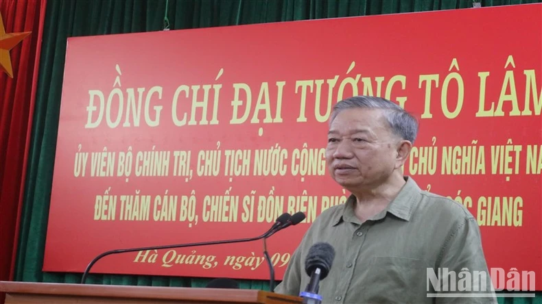 Chủ tịch nước Tô Lâm phát biểu ý kiến khi thăm Đồn Biên phòng cửa khẩu Sóc Giang.