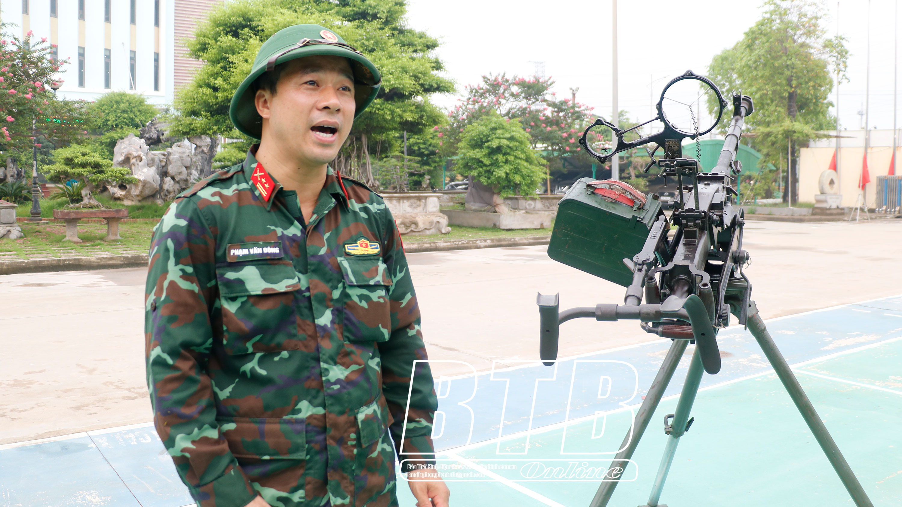 Cán bộ Ban CHQS huyện hướng dẫn kỹ thuật sử dụng súng máy phòng không cho các dân quân binh chủng.