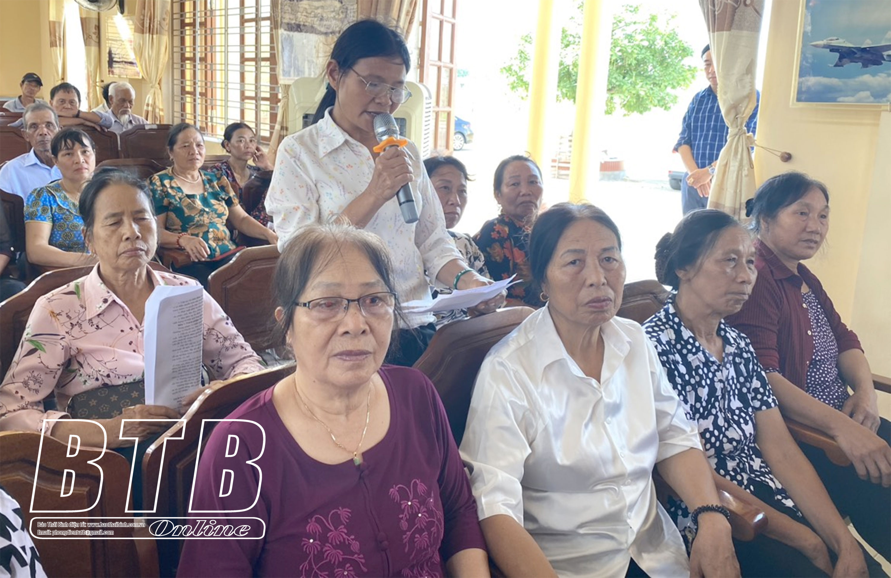 Cụ thể, nhiều ý kiến đề nghị huyện chấn chỉnh, đẩy nhanh tiến độ cấp giấy chứng nhận quyền sử dụng đất; đề nghị tỉnh, huyện hỗ trợ các trang thiết bị trong nhà văn hóa của các thôn; cứng hóa mặt đê của một số đoạn đê qua địa bàn; thanh toán kinh phí hỗ trợ các tuyến đường thắp sáng đường quê đã lắp đặt; phản ánh tình trạng ô nhiễm môi trường, ô nhiễm nguồn nước, bất cập trong xử lý rác thải sinh hoạt ở nông thôn; sản xuất nông nghiệp tại địa bàn manh mún, hiệu quả thấp, chưa có mô hình nông nghiệp công nghệ cao; chưa có cơ chế hỗ trợ thỏa đáng đối với cán bộ đoàn thể các thôn.
