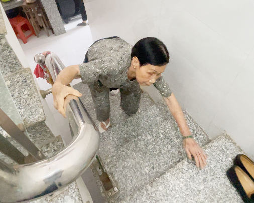 Cô Vân phải bám vịn, bò lên cầu thang vì những cơn đau buốt từ lưng xuống chân
