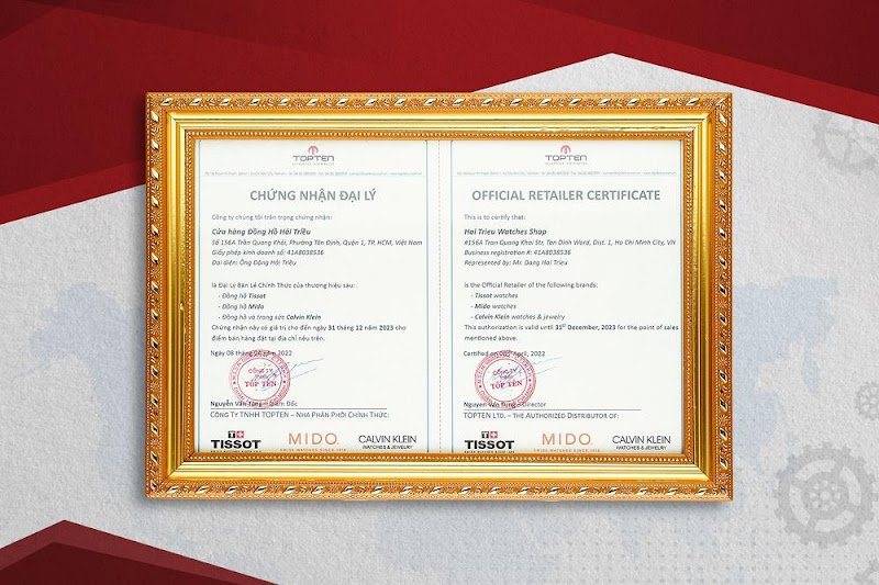 Giấy chứng nhận Đồng Hồ Hải Triều là đại lý ủy quyền của thương hiệu Tissot tại Việt Nam.
